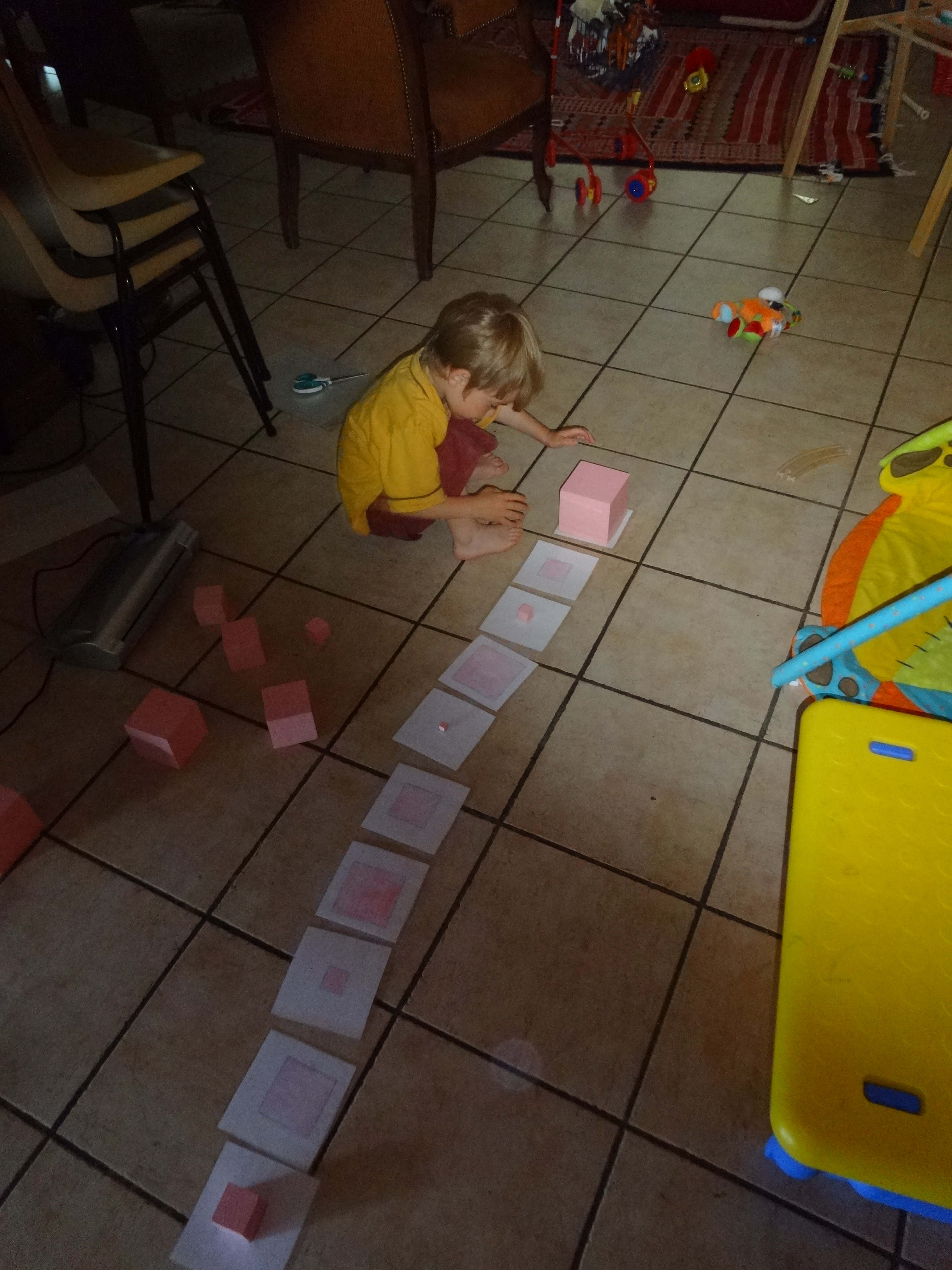 Il le fait avec beaucoup d’application ! Je lui avais d’abord proposé les perles carrées, plus faciles, puis il a enfilé aussi les rondes. C’est une bonne étape avant de les enfiler sur un lacet !