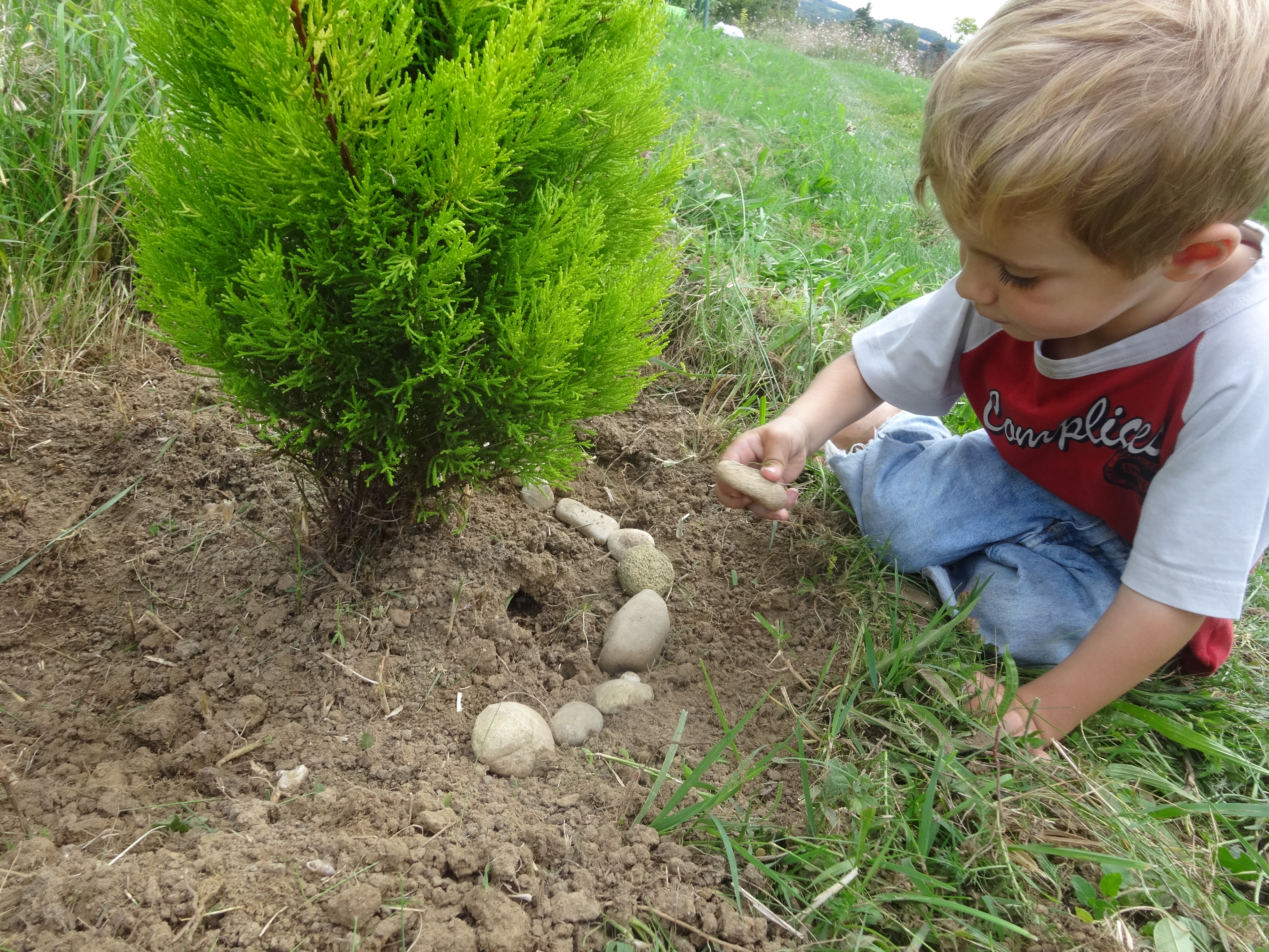 Alors pendant que je désherbais, je lui ai proposé de faire le tour des arbustes avec des galets « pour faire joli ».
