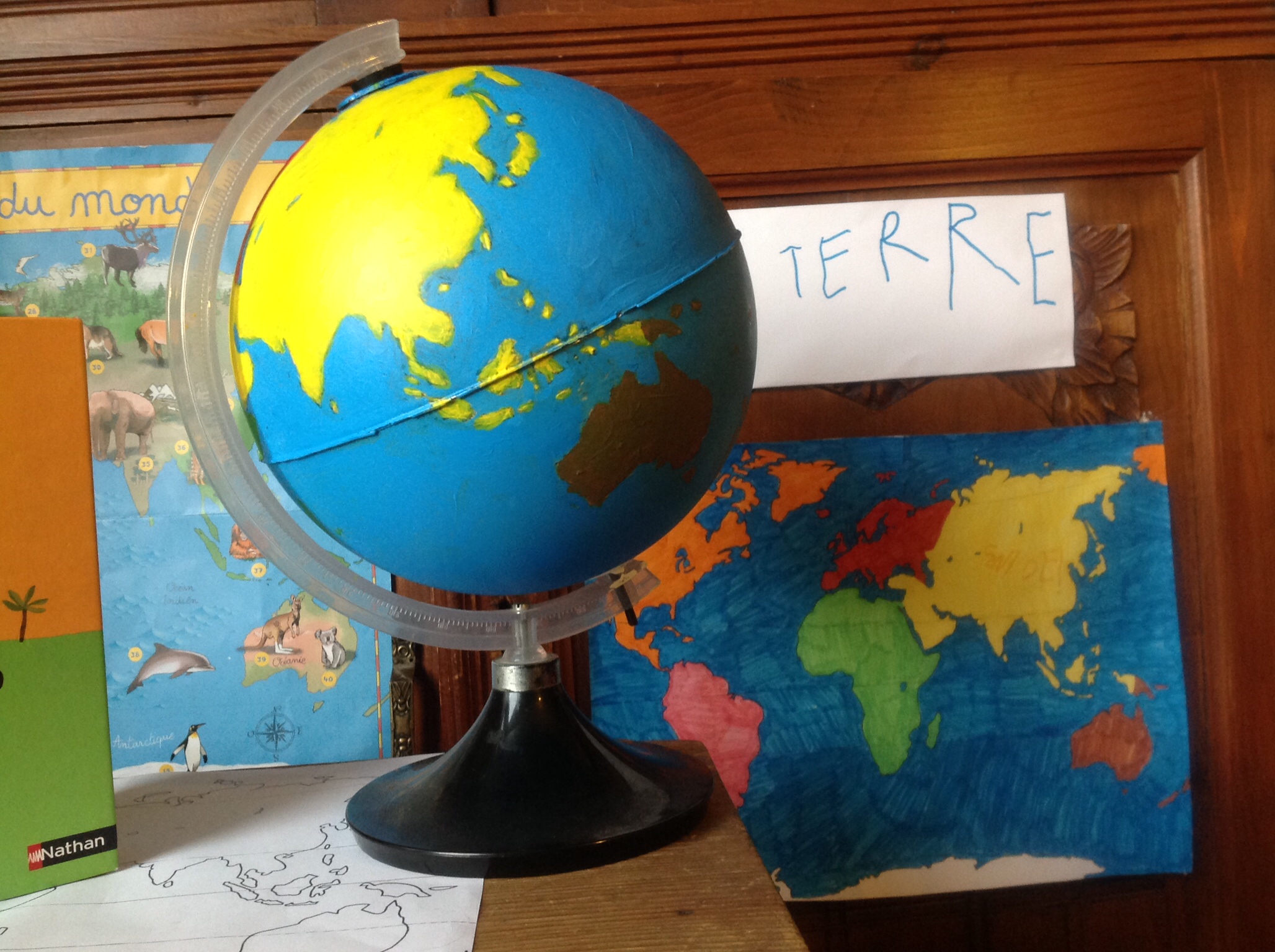 J’ai aussi colorié notre petite carte suivant les mêmes couleurs. Noé a écrit des lettres sur la carte en disant « j’ai écrit la Terre ! ». J’ai commencé par rouspéter puis en voyant son air déçu de mon manque d’enthousiasme, je lui ai demandé s’il voulait faire une étiquette en écrivant « LA TERRE », ce qu’il a accepté avec joie !