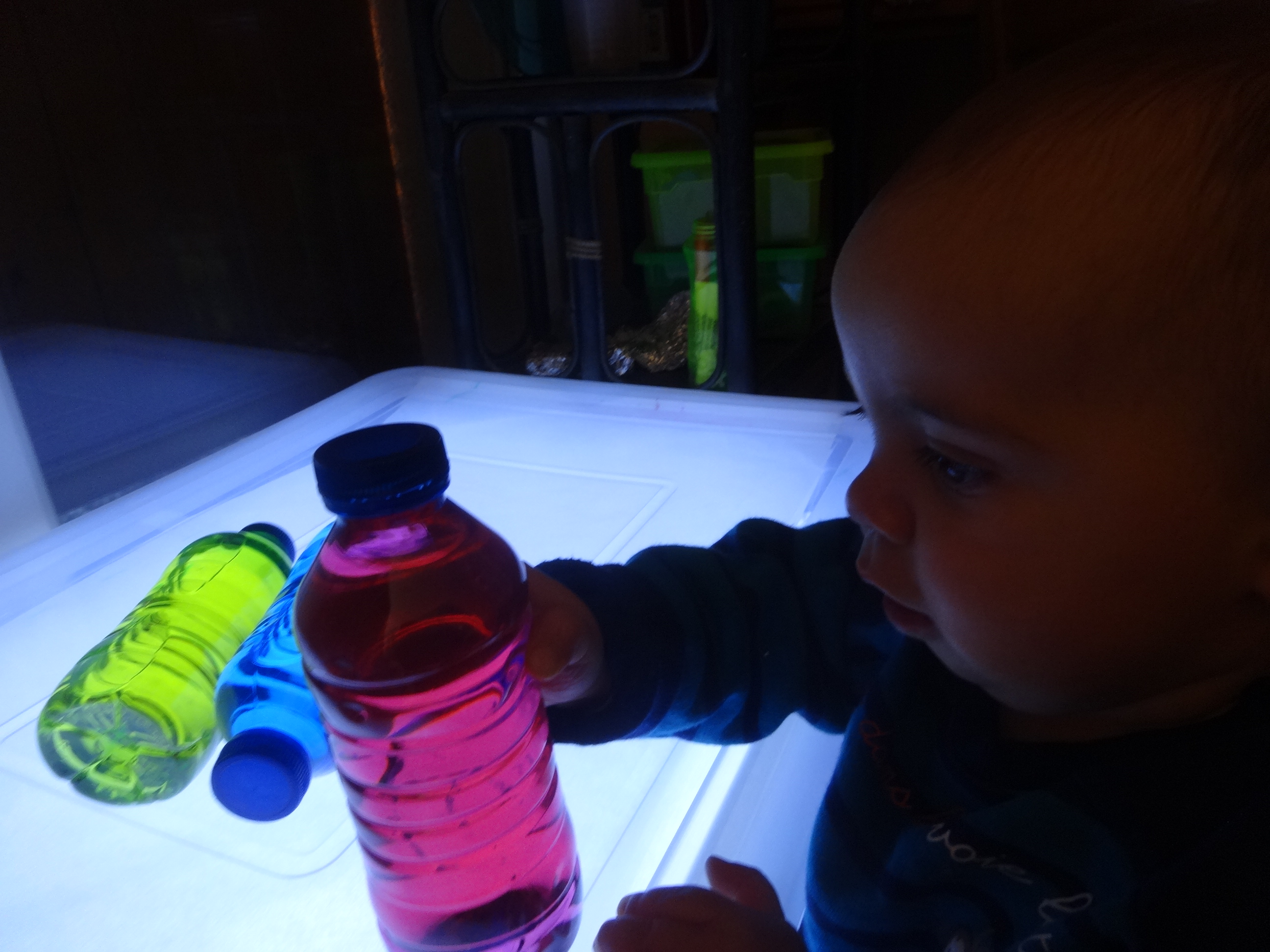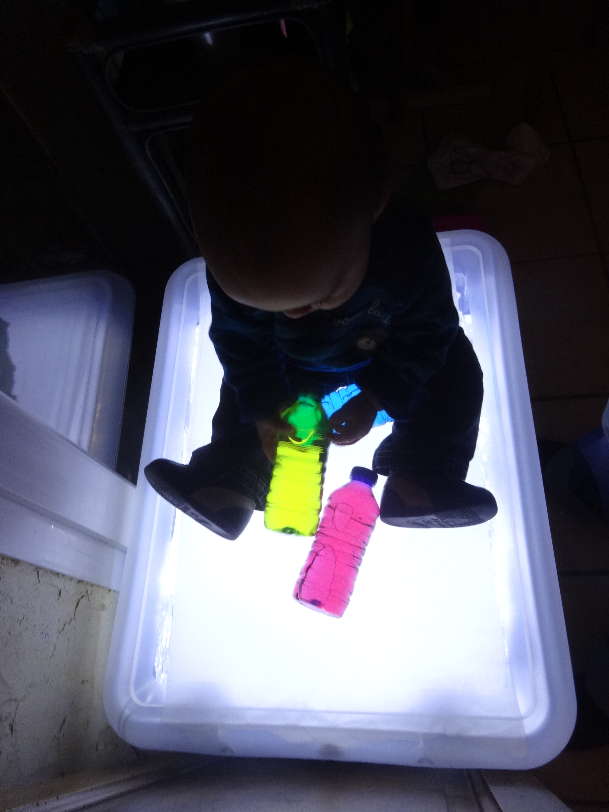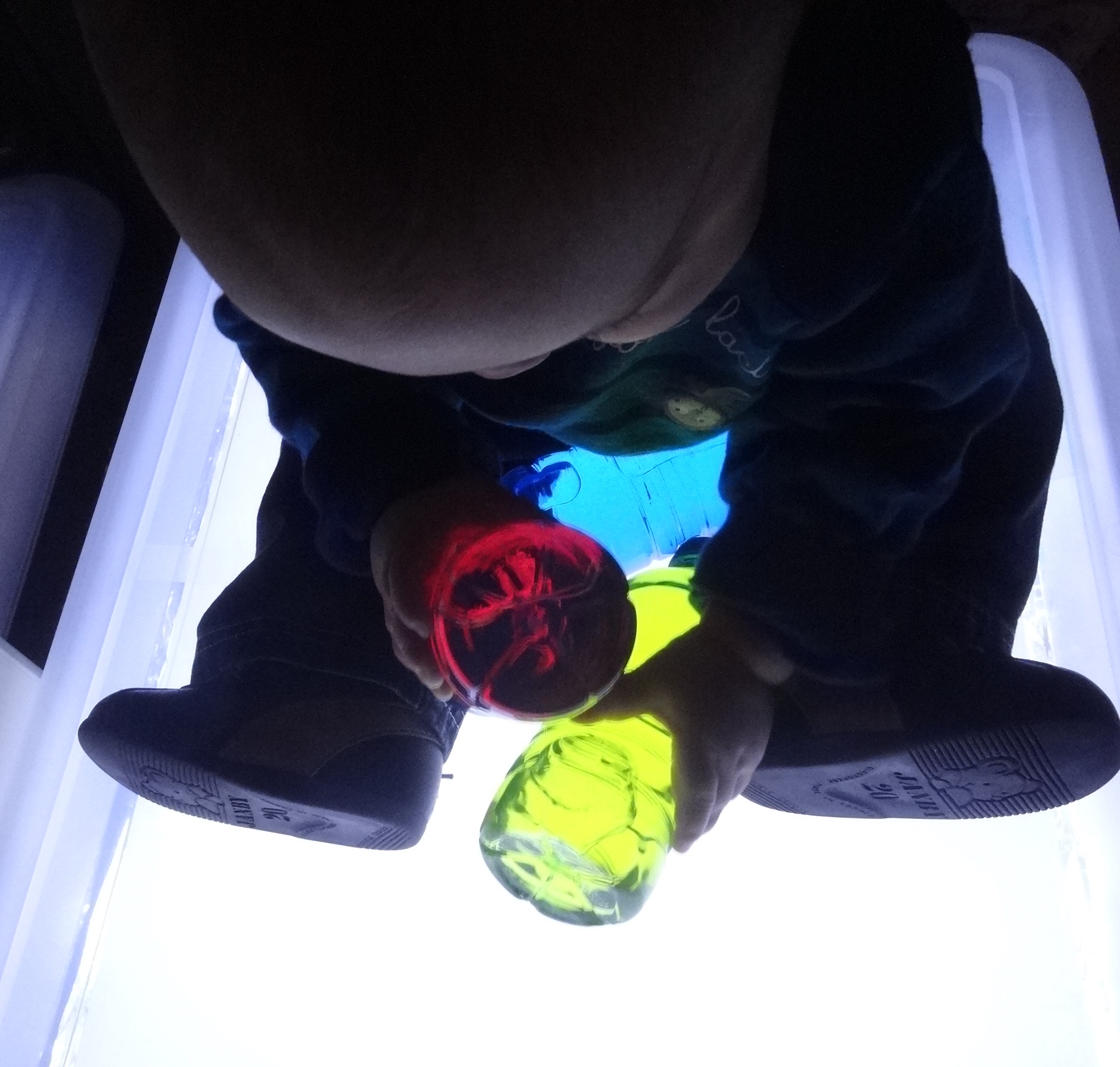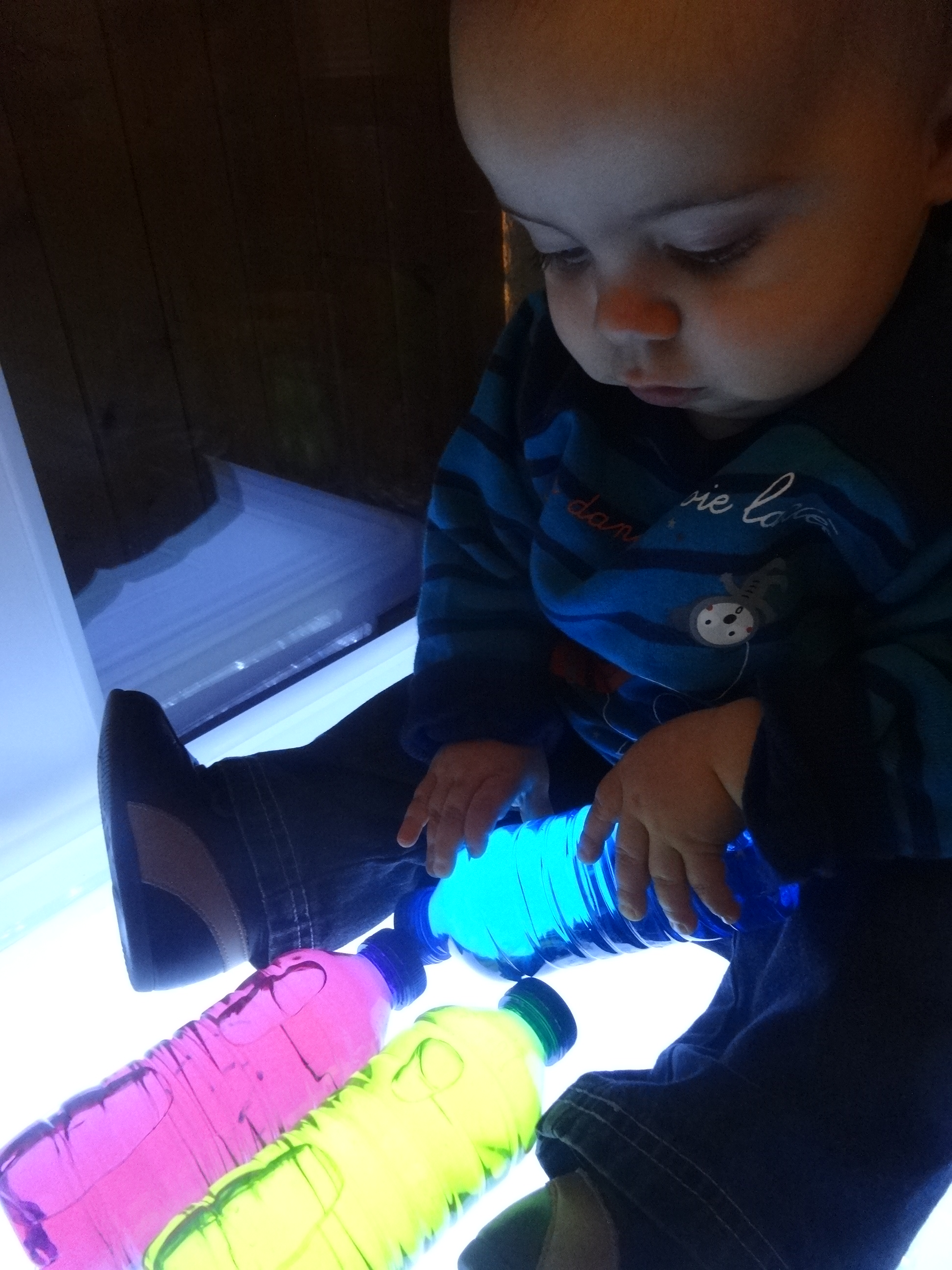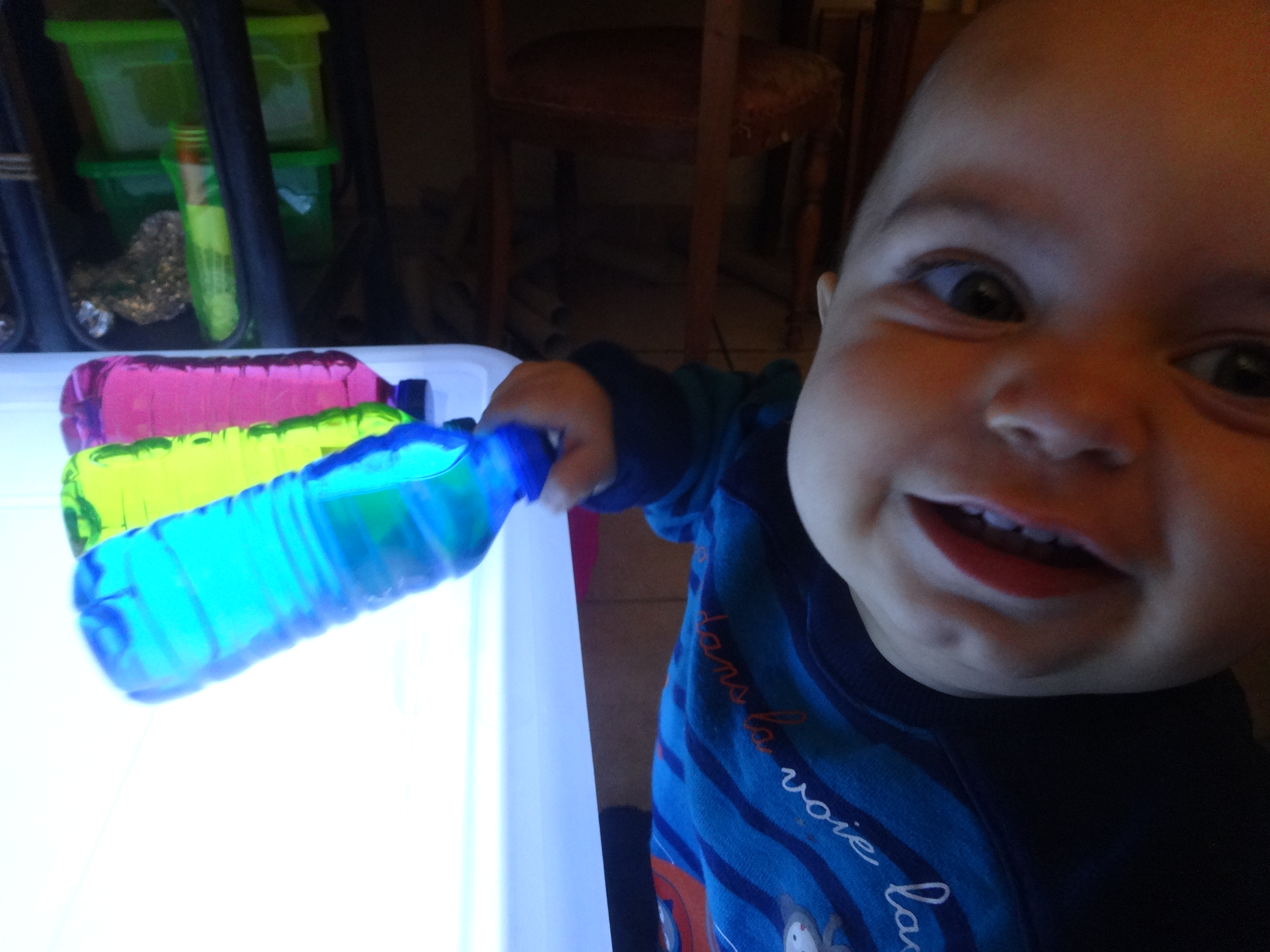 Cette fois-ci, c’est Firmin qui va découvrir la table lumineuse pendant que les grands sont à l’école. Je lui ai donc donné mes bouteilles arc-en-ciel. Pas de petits éléments à avaler, pas trop grosses donc manipulables assez facilement pour ses petites mains.