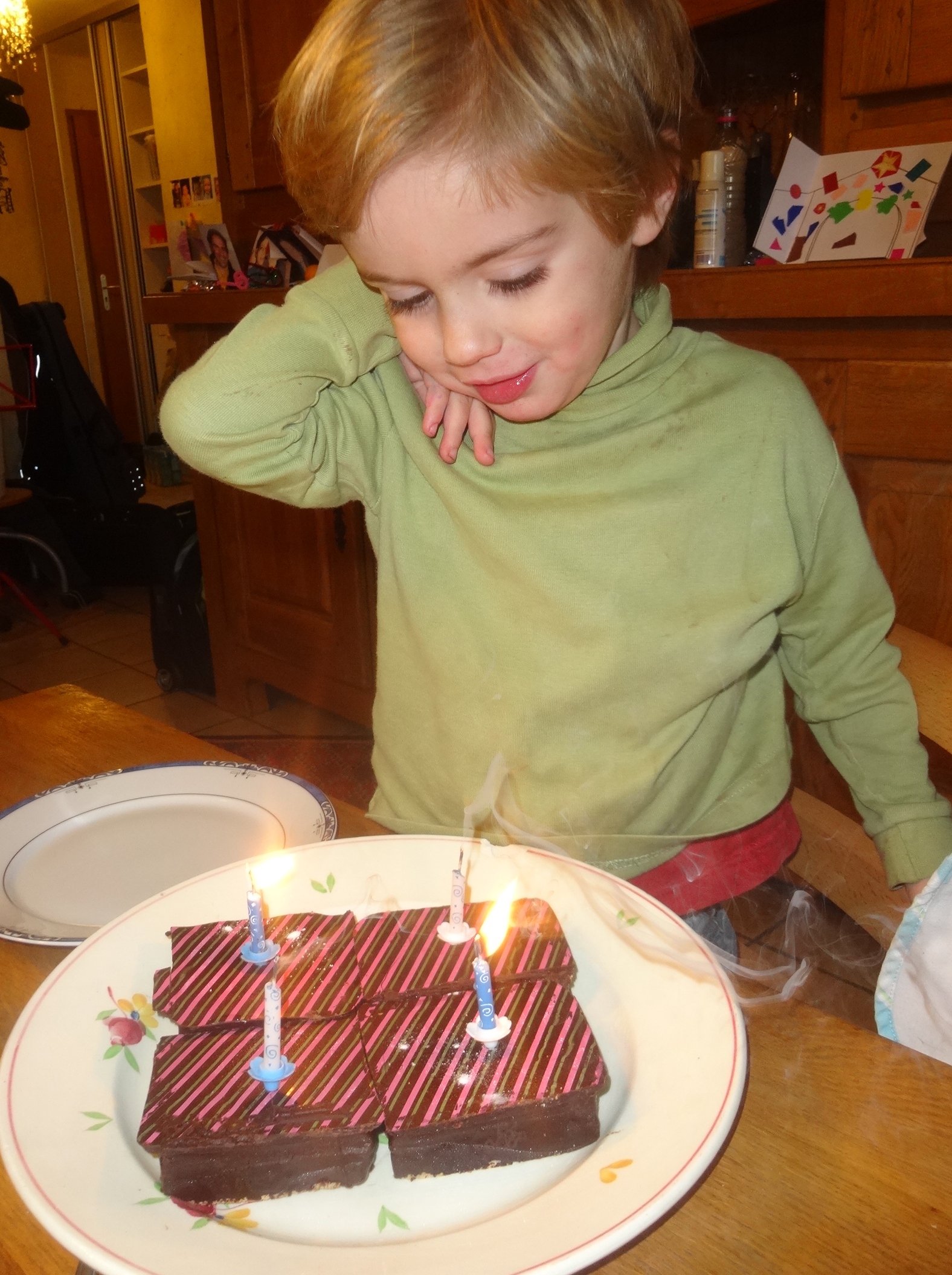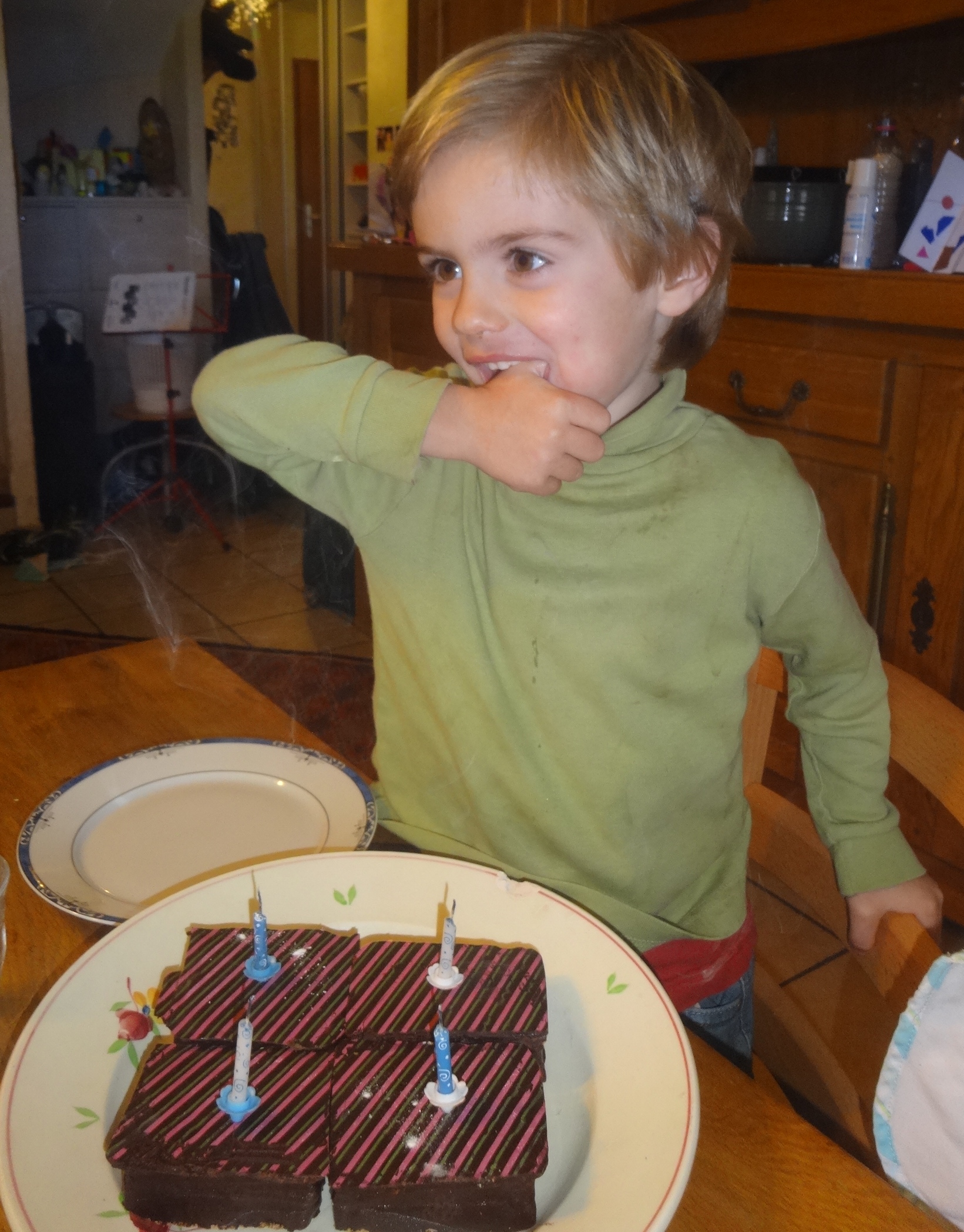 Il était attendrissant notre Noé, tout intimidé devant ses quatre bougies ! Tout étonné lui-même et impressionné d’avoir quatre ans !