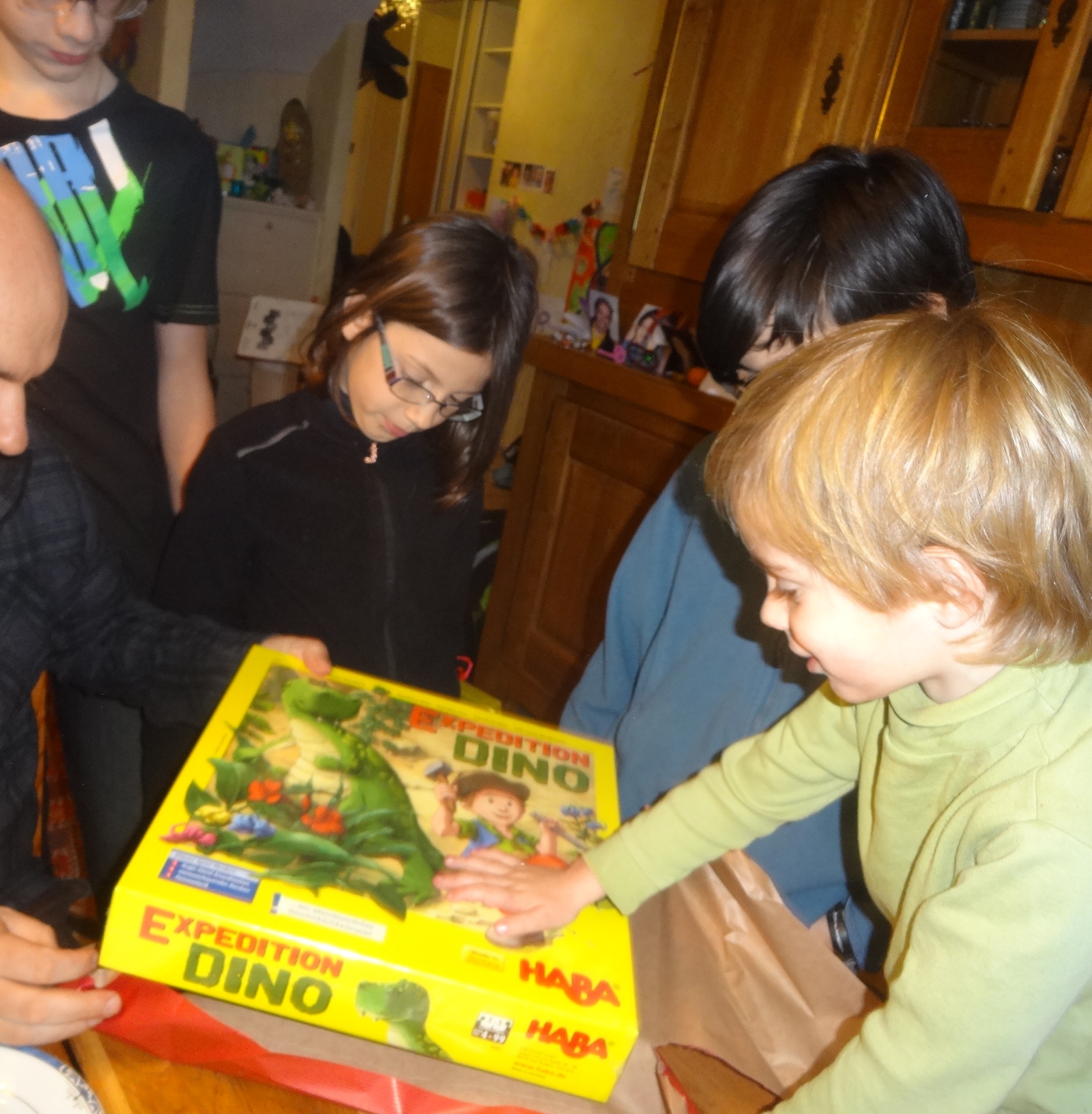 Il a quand même eu le temps d’ouvrir un cadeau, un joli jeu offert par sa mamie : Expédition Dino qui m’a l’air très sympa et dont je vous parlerai sûrement plus tard quand nous l’aurons testé !