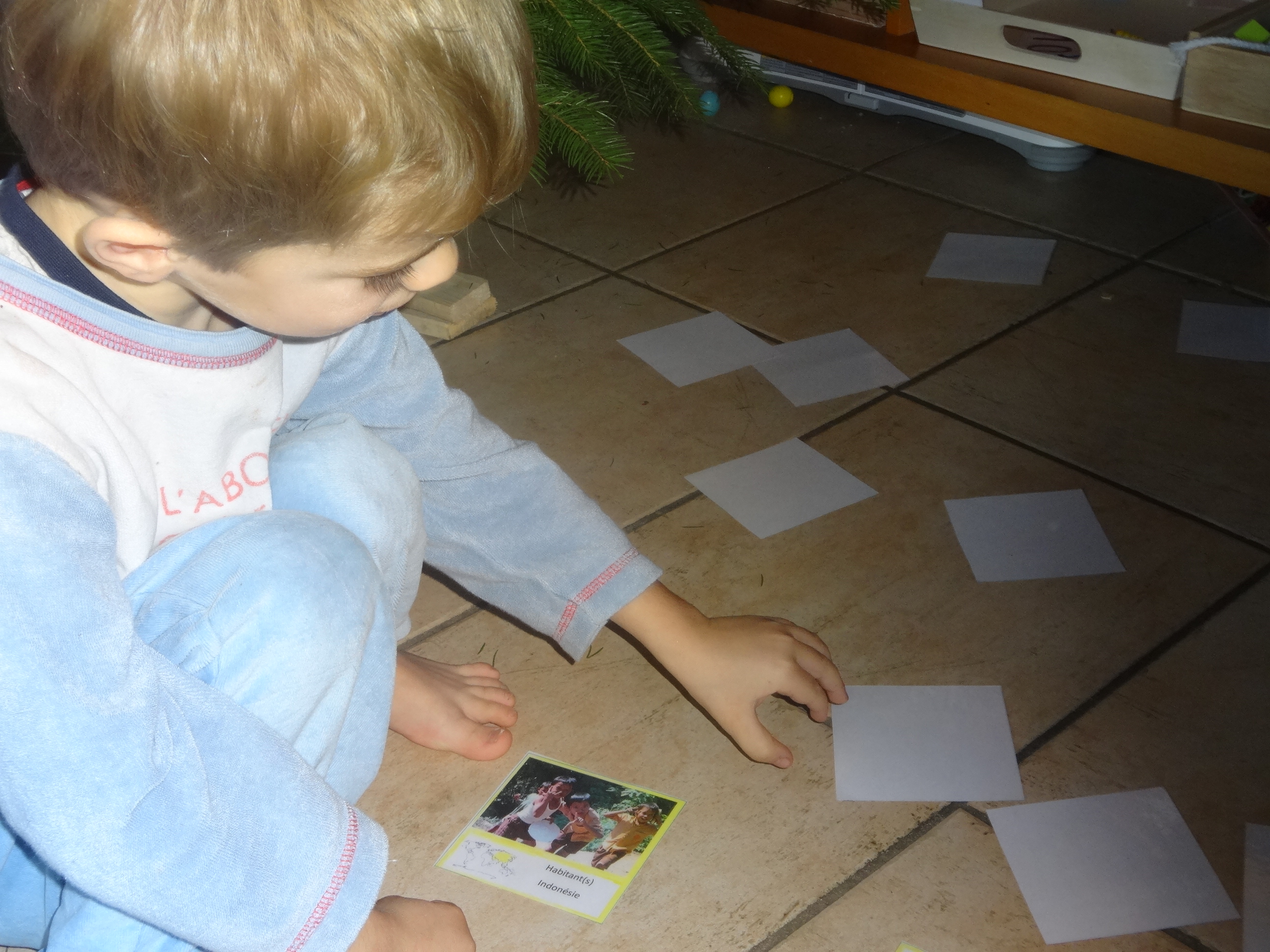 Je vous avais expliqué précédemment comment nous avions découvert le monde façon Montessori puis je vous avais montré les cartes que j’avais faites sur les habitants du monde. Noé a voulu les ressortir mais il n’aime pas trop jouer plusieurs fois de la même façon. Il a donc commencé à me dire que nous devions mettre à l’envers chacun à notre tour une carte. Bon, ok Noé, mais ensuite ? Ensuite, il n’avait plus trop d’idées ! Alors je lui ai proposé de faire une sorte de Memory : chacun à notre tour, nous retournions deux cartes.