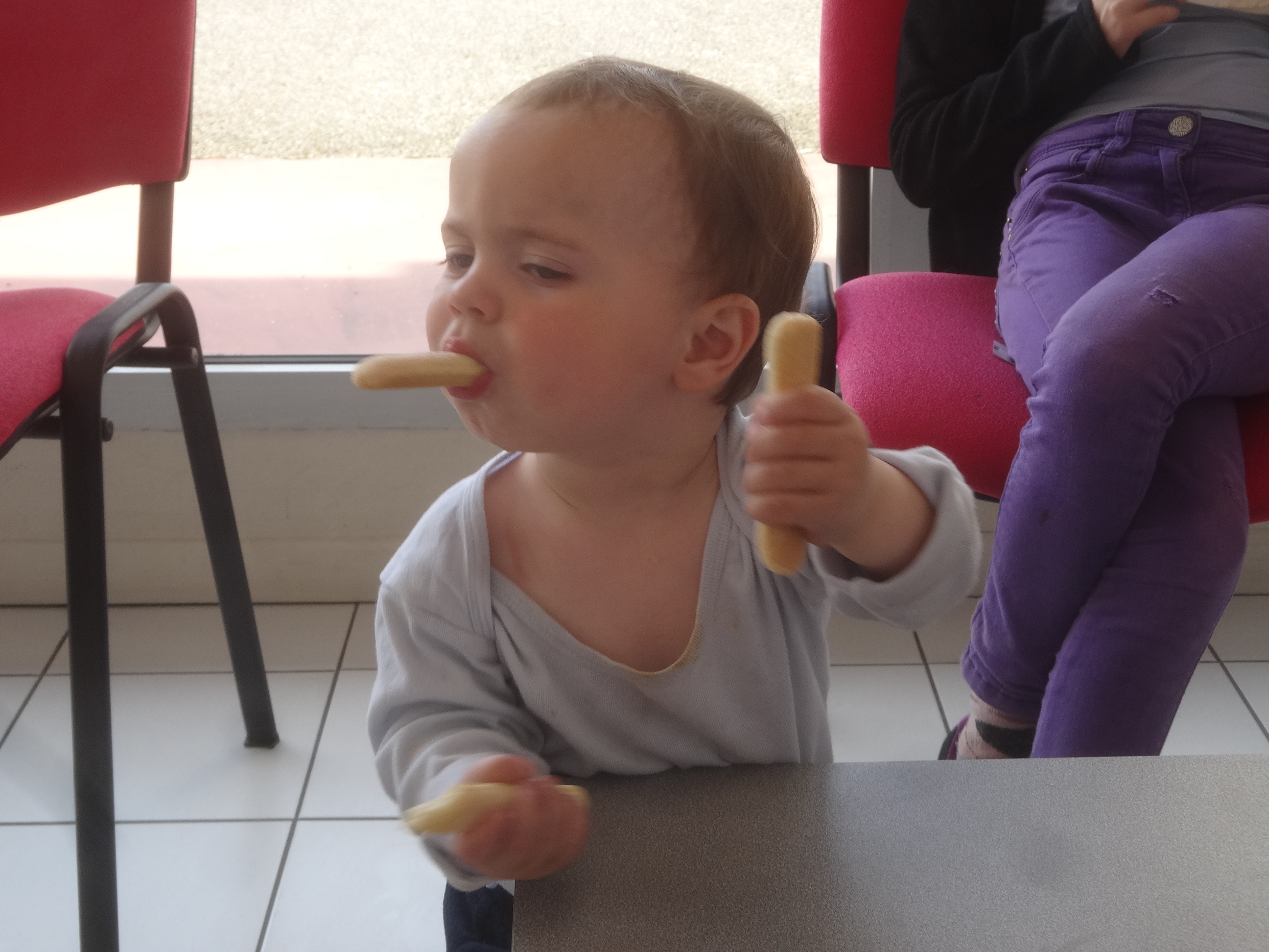 … Et pour finir la semaine en beauté, nous avons visité Carglass puisque certains ont eu la bonne idée de nous casser notre vitre pour piquer nos valises … Alors pour patienter, Firmin a essayé de manger trois biscuits en même temps !!! Exploit réussi !