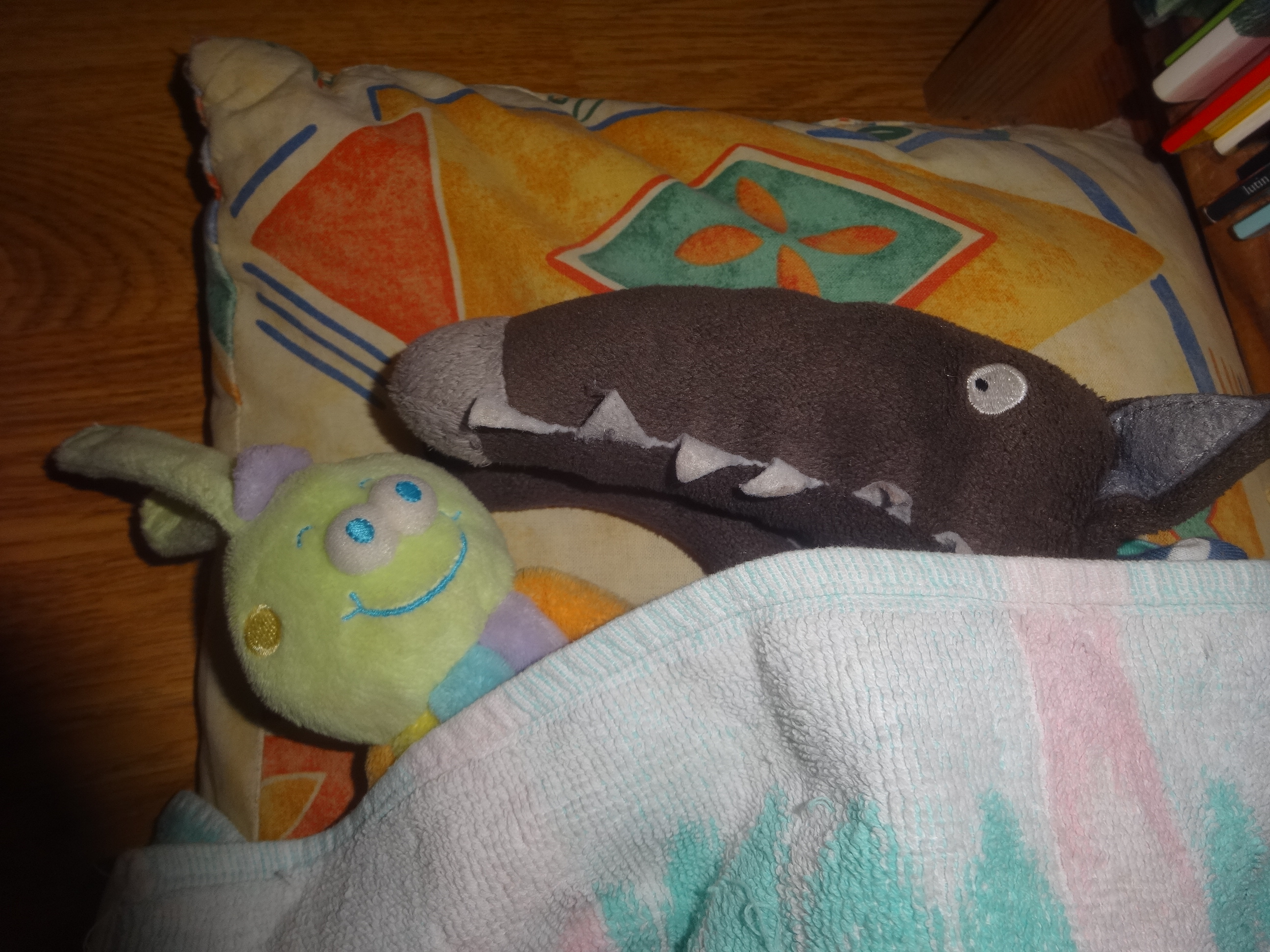 Pour dormir, plutôt que de le garder avec lui dans son lit, Noé a préféré préparer un petit lit douillet pour Monsieur Loup. Un coussin confortable, une petite couverture …DSC00140