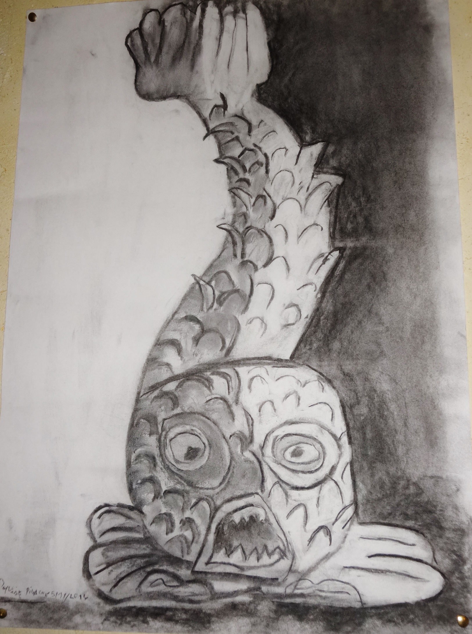 Voici le dauphin de Baptiste dessiné au fusain d’après une sculpture représentant le dauphin du Dauphiné.