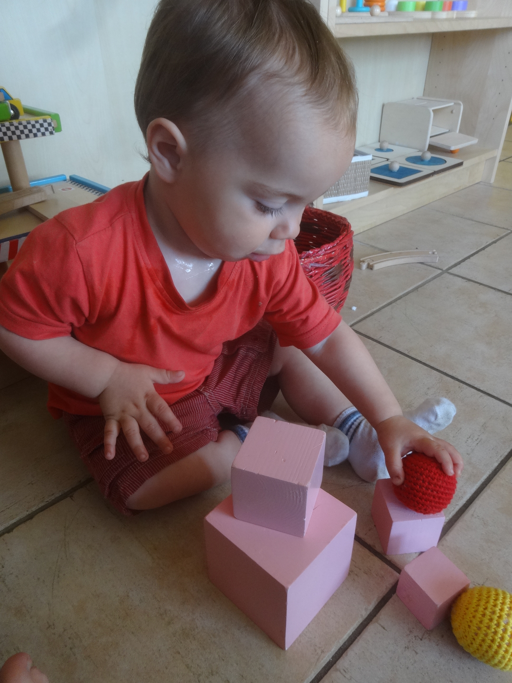 Et effectivement, à la maison, on retrouve ce goût pour porter les gros cubes lourds, (c’est pour ça que les cubes en bois plein, c’est bien, car l’enfant ressent le poids des objets, ce qui n’est pas le cas pour des cubes en plastique ou en carton), les empiler et les jeter. Bon, jeter les briques, ça ne me dérangeait pas, mais jeter les cubes de la tour rose Montessori , j’aime moins …