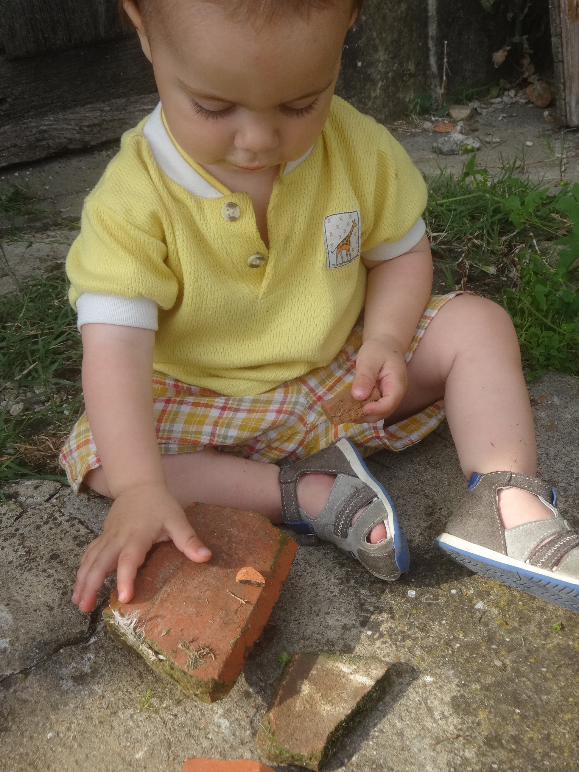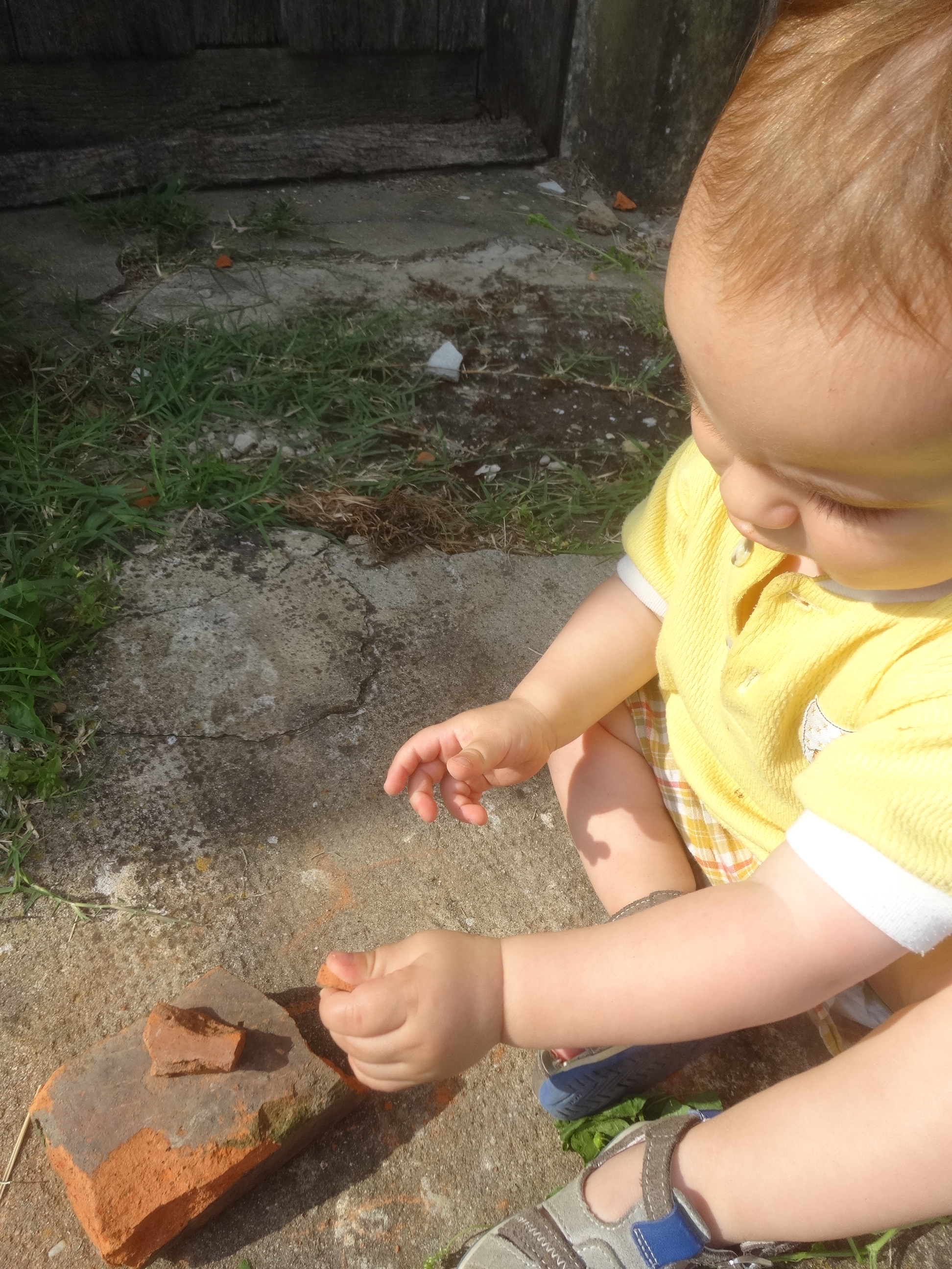 Il s’est installé, et du coup moi aussi ! Et je l’ai regardé faire : il a passé un long moment à transporter ses briques, à les lancer dans l’herbe devant lui, à retrouver les chercher. Il portait à la fois avec beaucoup de concentration les gros morceaux de brique un peu lourds, et les tout petits bouts.DSC00694