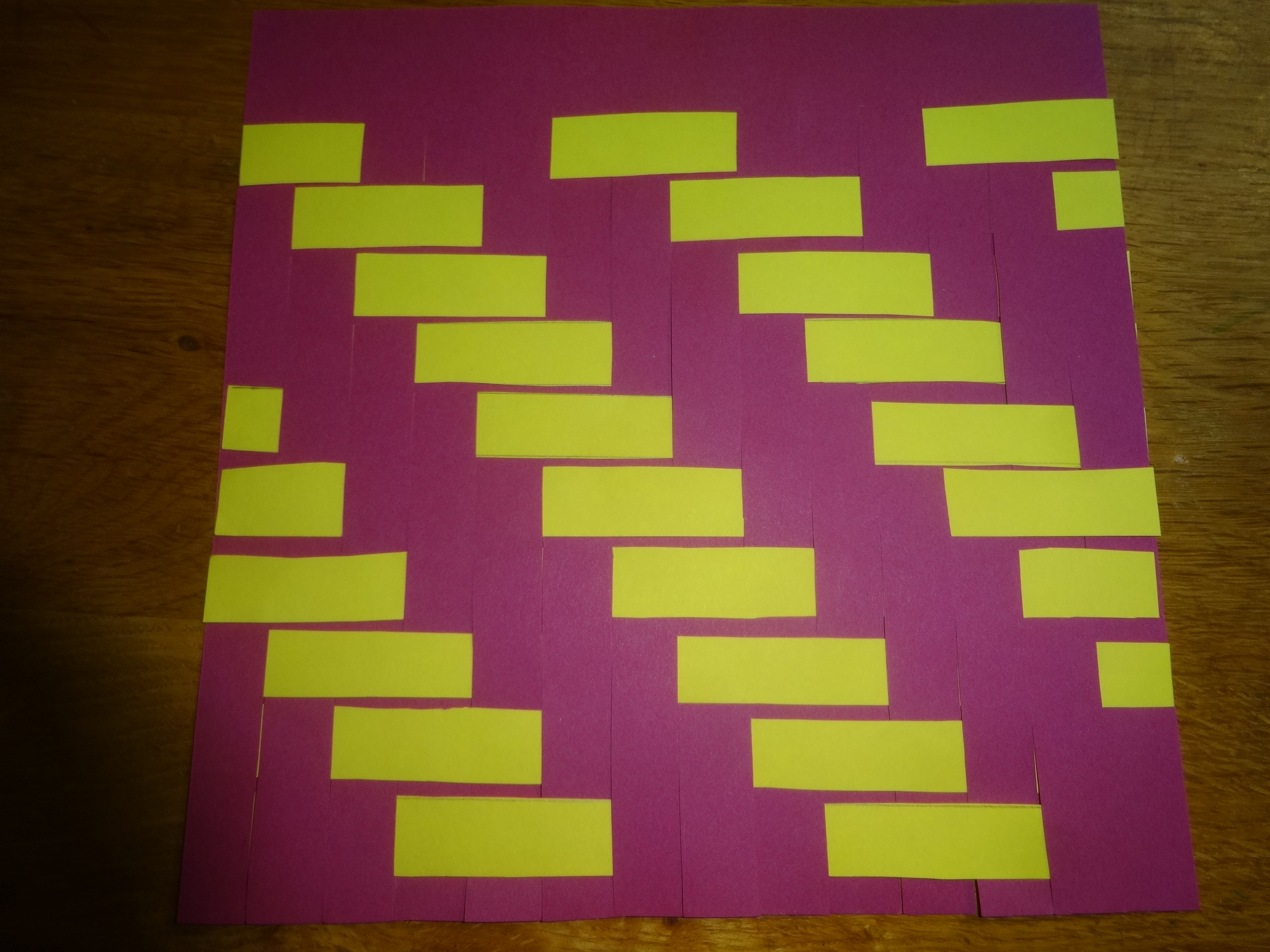 Le tissage le plus simple consiste à passer la bande jaune une fois dessus, une fois dessous les bandes violettes.