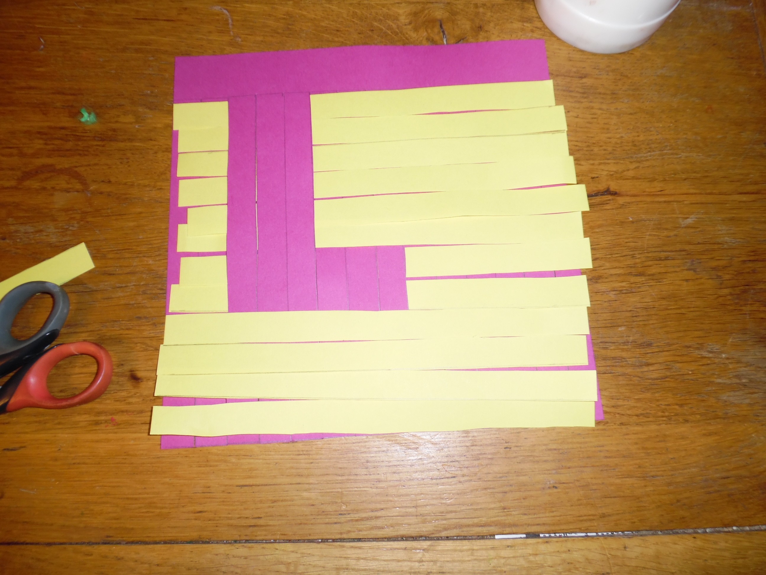 On découpe le carré jaune en bandes de papier. Idem pour le carré violet sauf que l’on ne découpe pas les bandes jusqu’au bout, ce qui donne des « franges ». On peut aussi couper au cutter sans couper les bandes jusqu’au bout, ni d’un côté ni de l’autre.