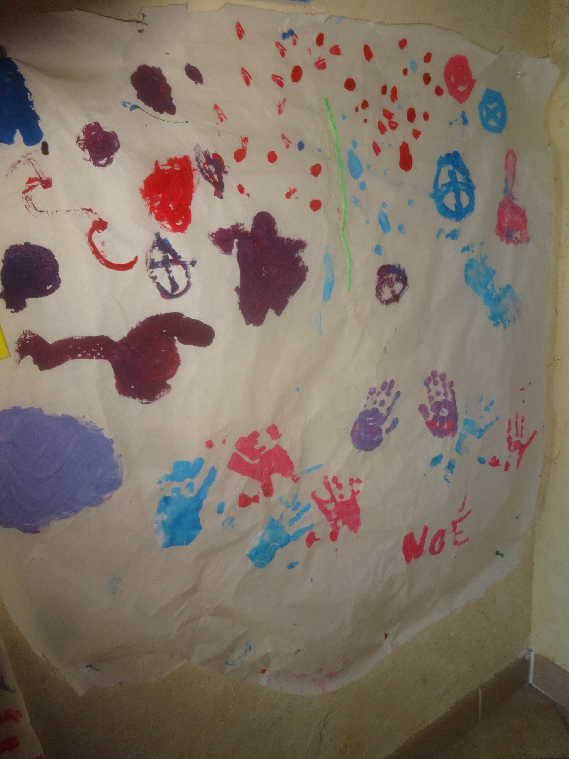 DSC01086Et puis un petit lutin Firmin s’est pointé et a commencé à toucher ce que faisait Noé. Alors dite, un bout de nappe aussi, un pinceau … et lui n’était pas décontenancé du tout ! C’était parti !DSC01090On teste un peu sur les pieds aussi, un peu sur le sol…DSC01093Noé continue tranquillement, Lison se tape l’incruste et s’y met aussi !DSC01094L’éclate totale !DSC01095Pas de soucis pour Firmin pour aller tremper son pinceau dans la peinture !DSC01099Vraiment un bon moment de liberté et d’expression.DSC01101Baptiste (qu’on ne voit pas sur les photos !) a aussi participé à l’engouement général !