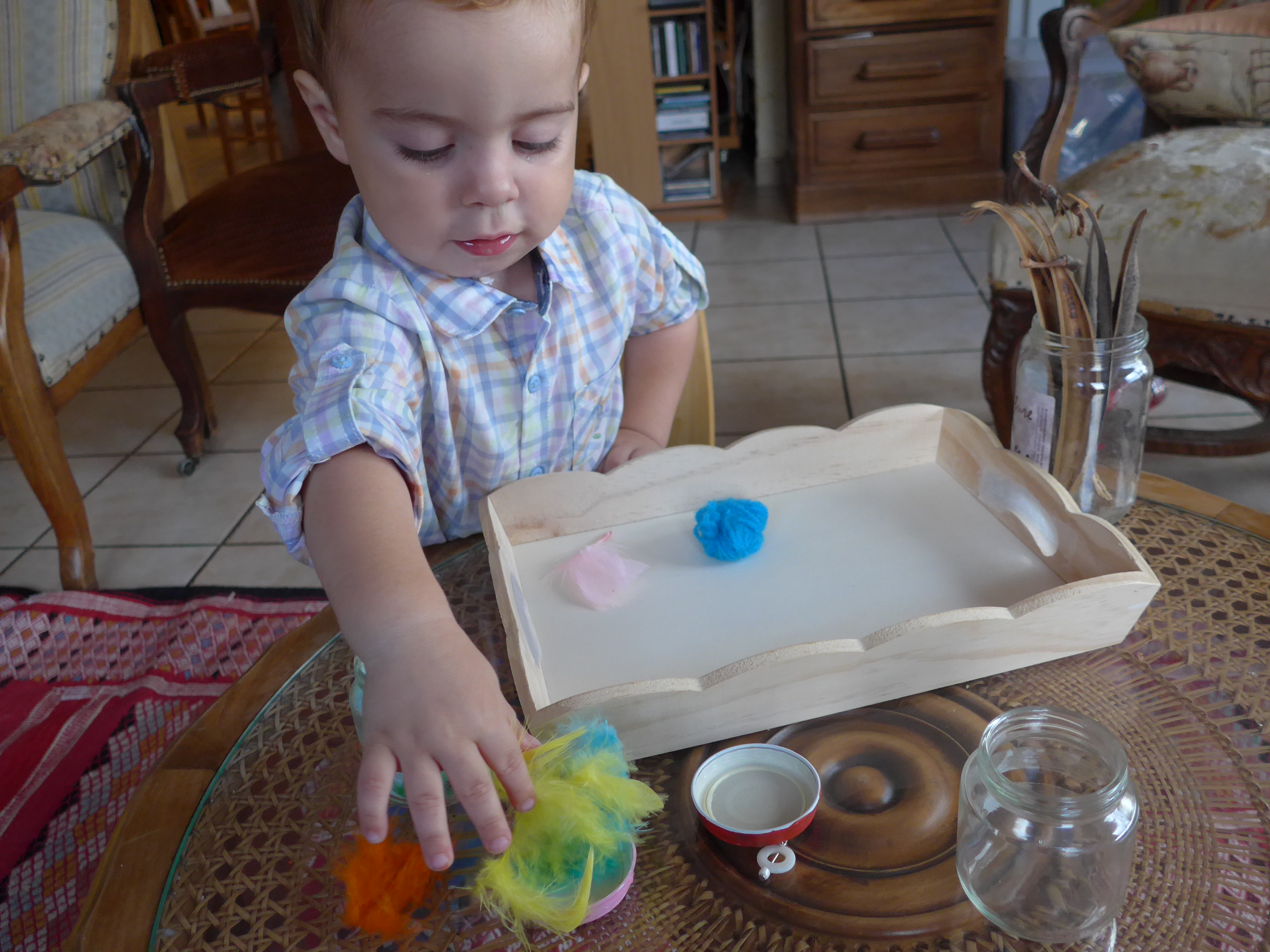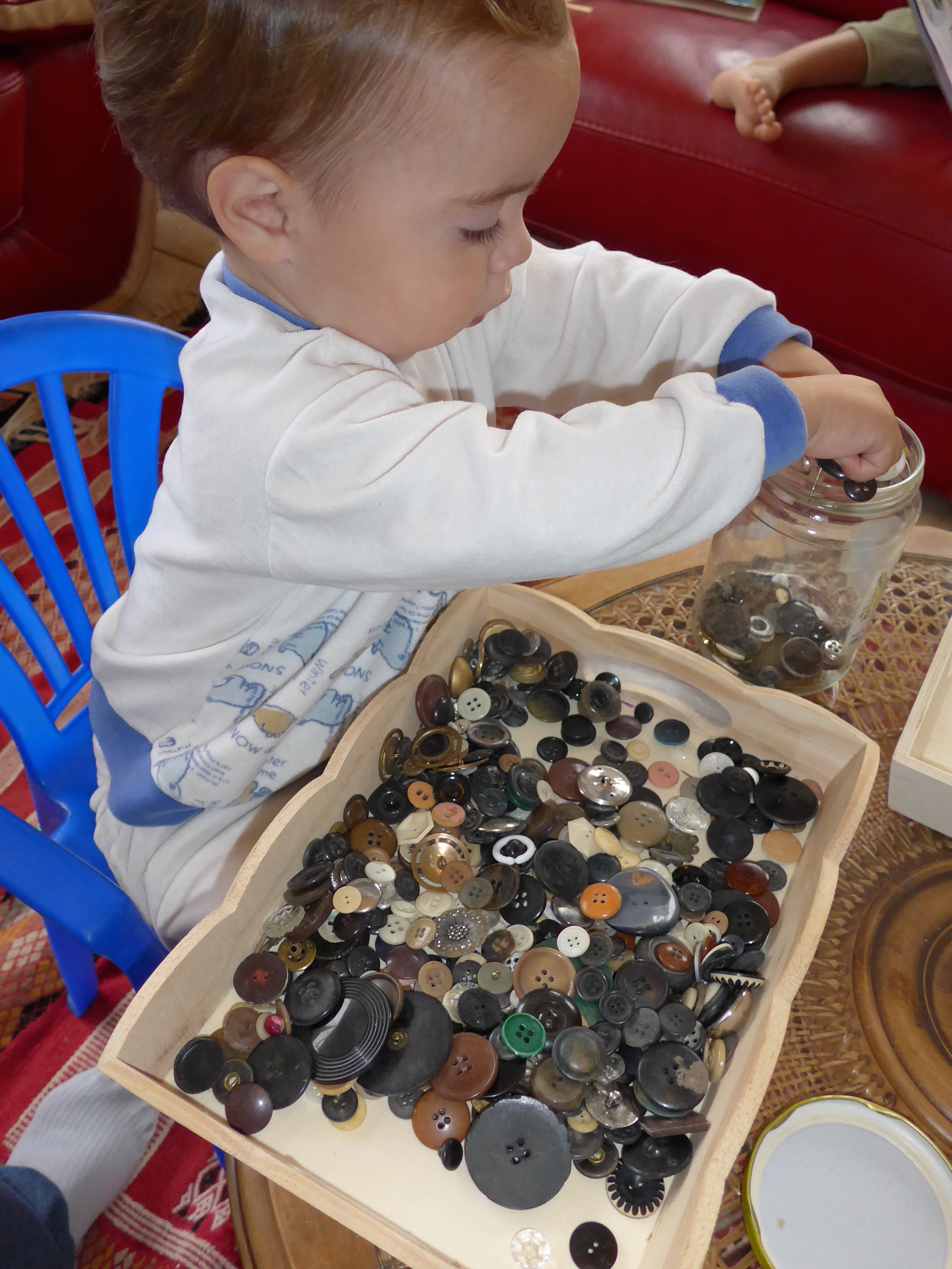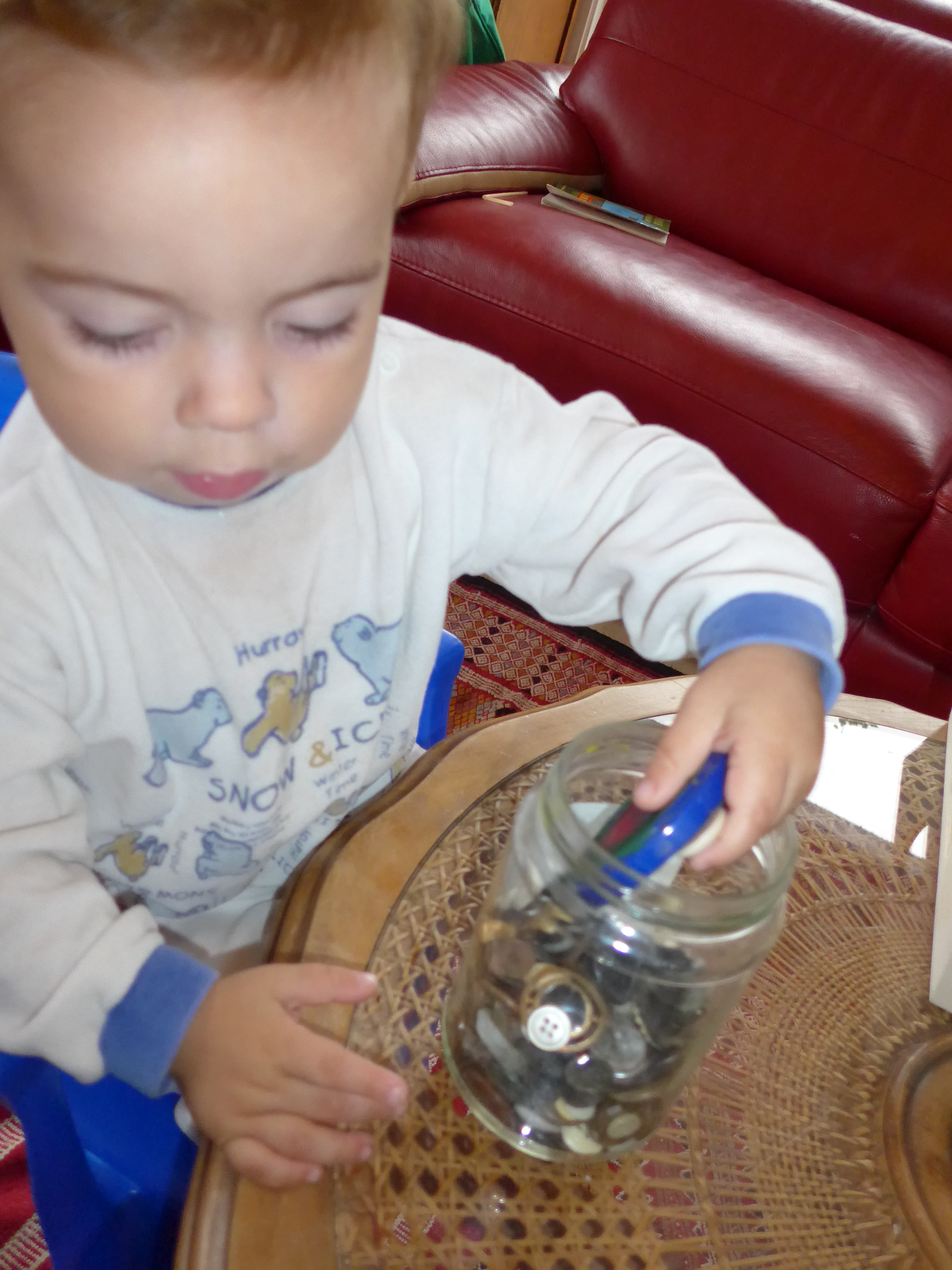 Il y a de cela plusieurs mois,  je vous avais parlé de nos « pots à trésors » (dont on avait d’ailleurs peint les couvercles avec Noé) . Ils sont repérés depuis un petit moment par notre Firmin qui n’avait jusqu’à présent pas trop le droit d’y toucher … Cette fois-ci, il est allé chercher un pot et je l’ai laissé faire. Je lui ai aussi donné du coup un petit plateau. Il a commencé à sortir ce qu’il y avait dans les pots.P1000352