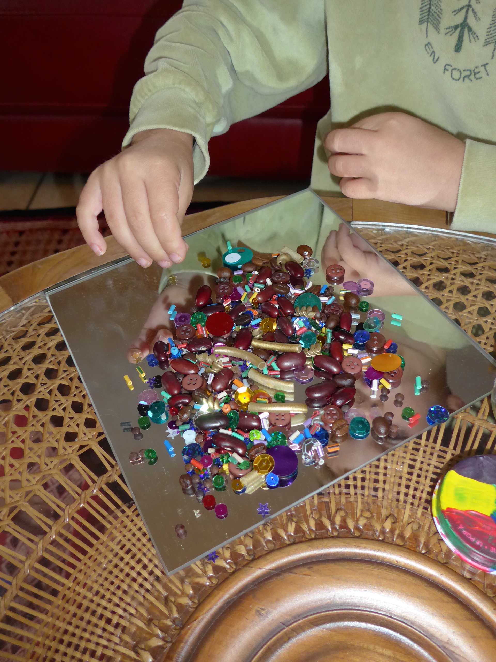 Là, Noé a utilisé des petits objets nacrés et les a posés sur son miroir. Puis il a commencé à les trier …