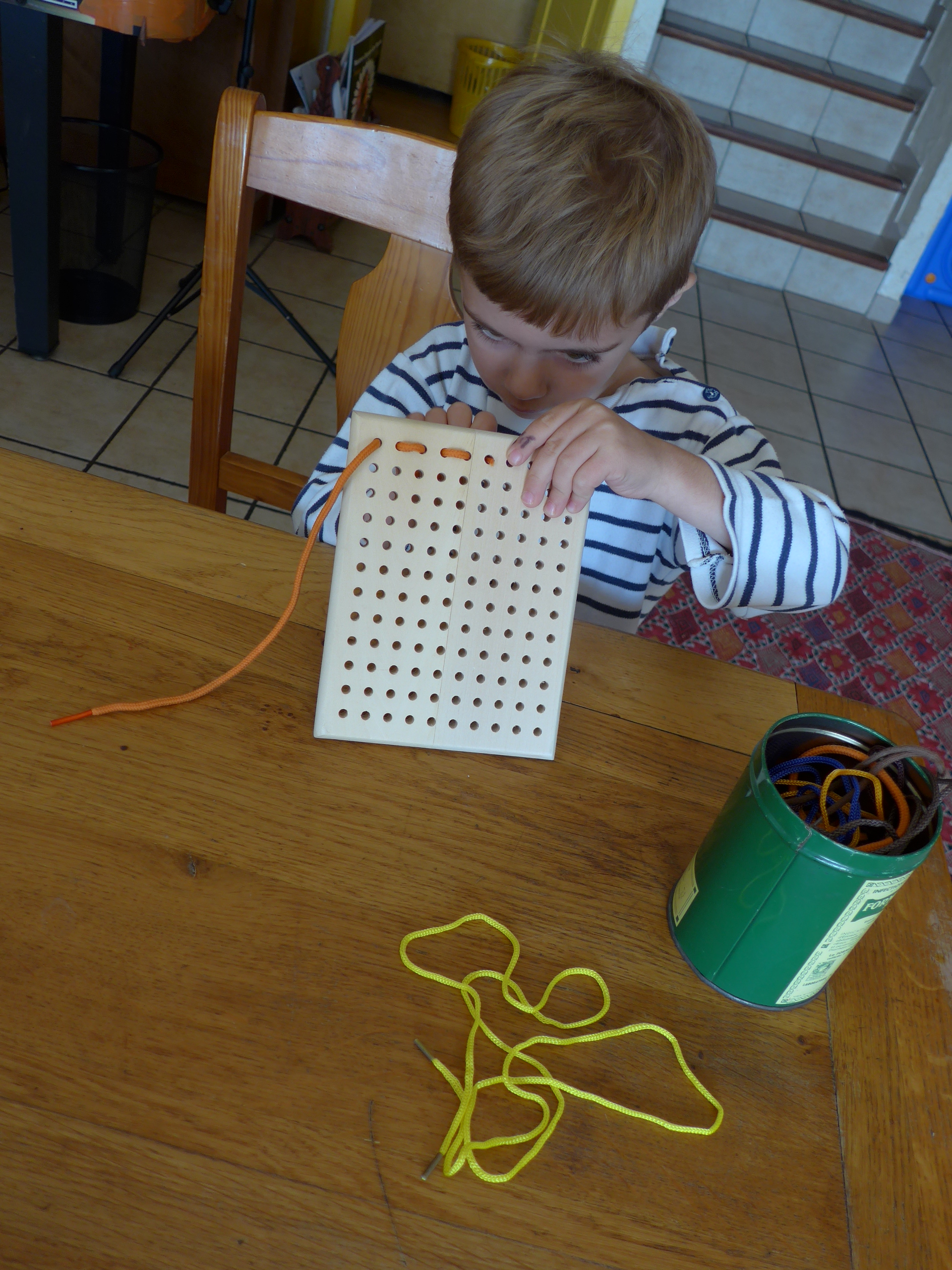 Voici un matériel qu’on n’a pas encore beaucoup exploité et que Noé est allé chercher l’autre jour : la planche à lacer.