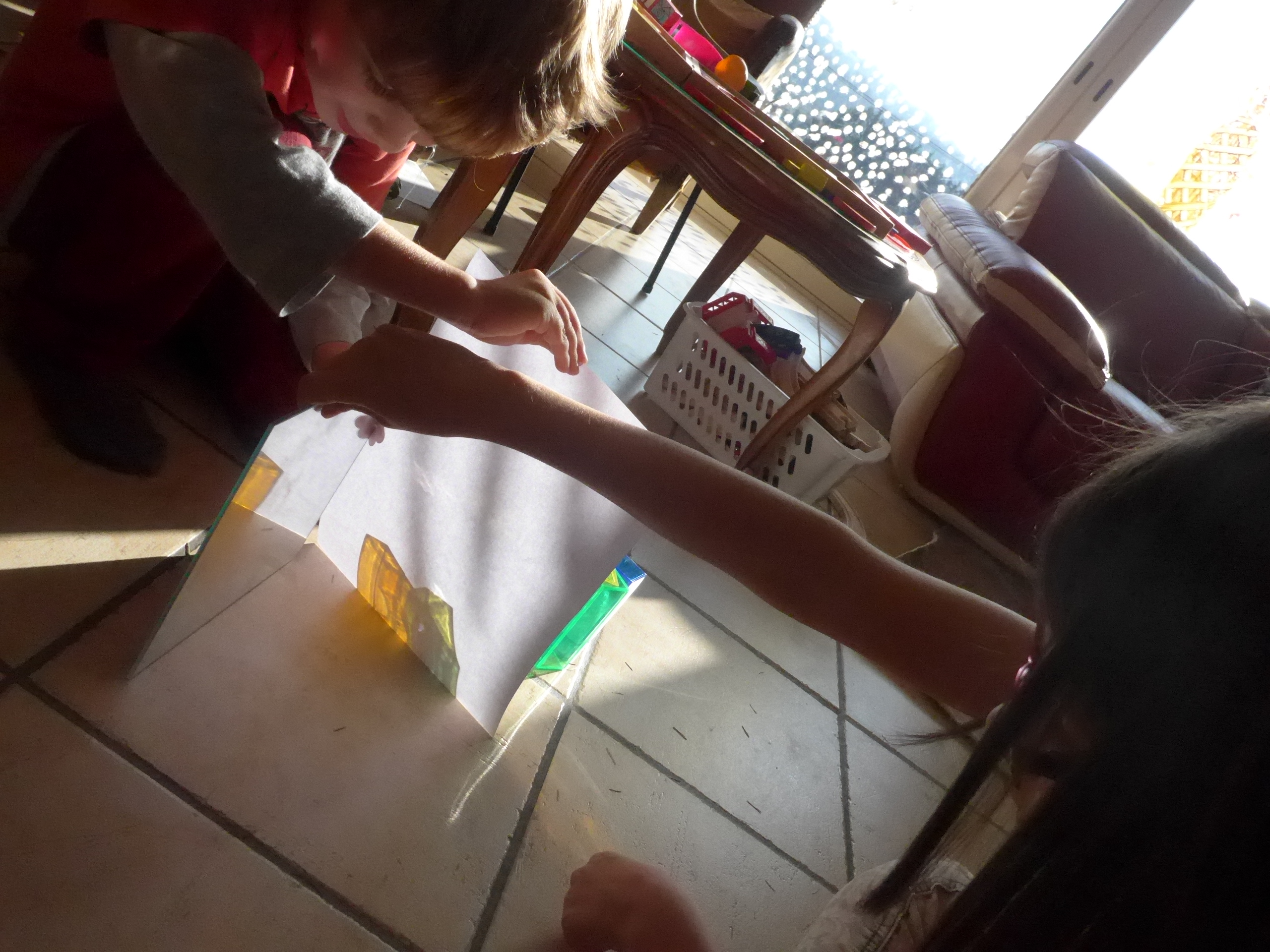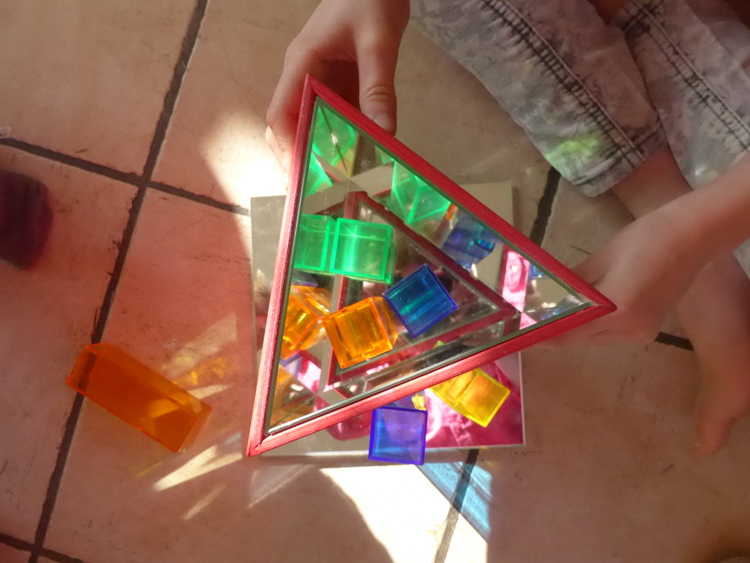 Et puis le père Noël quand même sympa avait aussi apporté un, on va dire « prisme triangulaire creux avec des miroirs à l’intérieur ». Alors il a été de la fête, et les enfants ont fait des essais en rajoutant d’autres miroirs …
