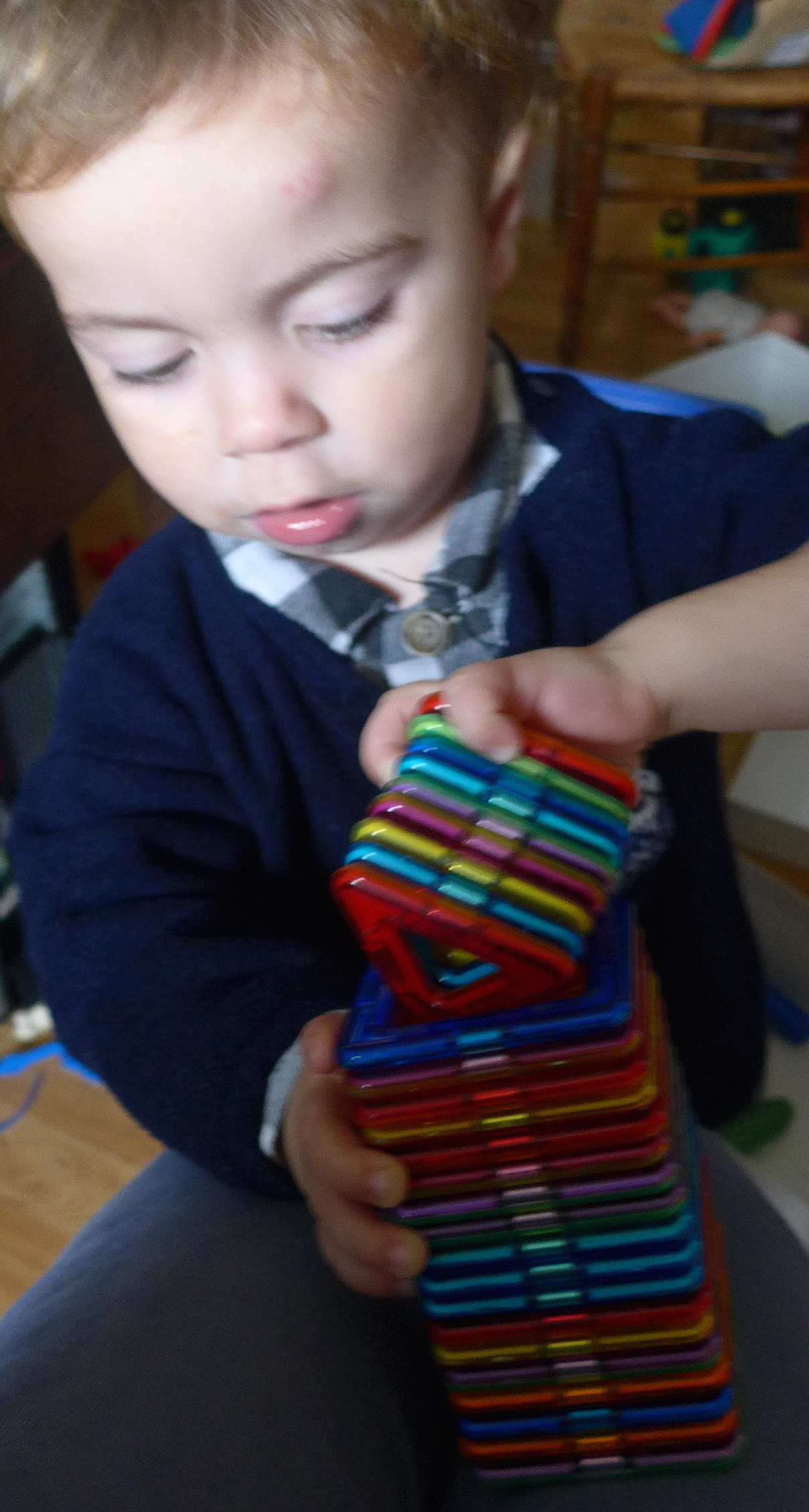 Première activité de Firmin avec ce jeu : faire une tour avec les carrés, ce qu’il aime beaucoup et fait souvent !