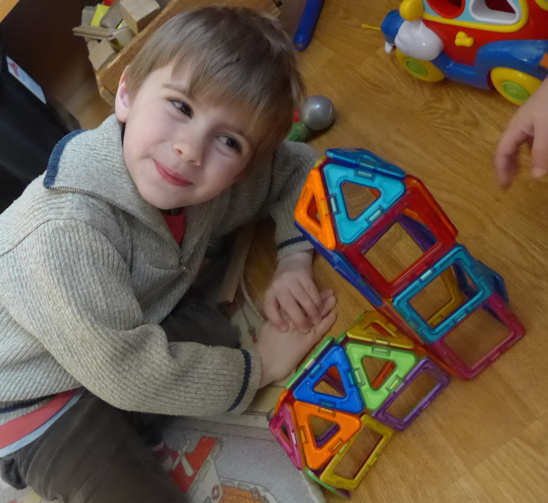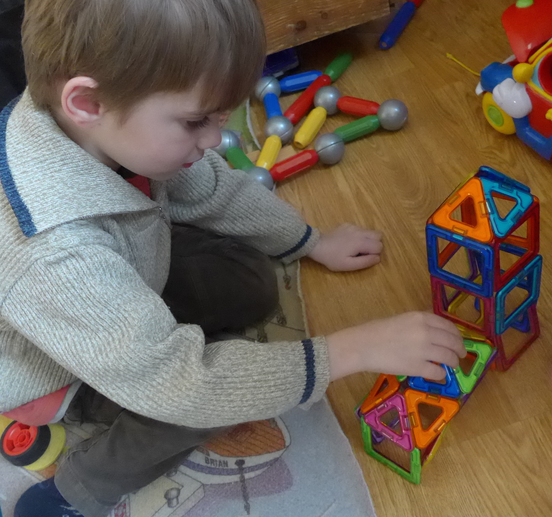Firmin avait eu pour son anniversaire une boîte de Magformers , un jeu avec des carrés et des triangles aimantés.