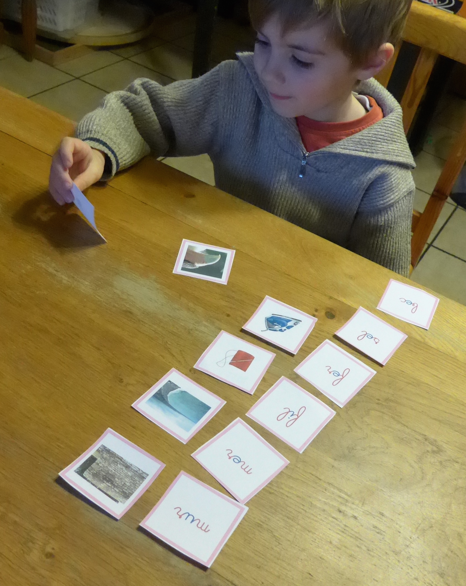 Normalement, ce matériel se présente après le travail avec les lettres rugueuses et l’alphabet mobile Montessori dont je vous ai parlé plus haut! Là, je lui ai simplement proposé les mots et les images et je lui ai dit d’essayer de retrouver celles qui allaient ensemble et je l’ai laissé se dépatouiller. C’était drôle de voir la joie qu’il avait quand il avait compris le mot et qu’il l’associait avec une image ! Ca faisait comme la petite ampoule qui s’allume dans les BD quand il comprenait ! Tous ces mots étaient des mots de 3 lettres de forme : consonne-voyelle-consonne.