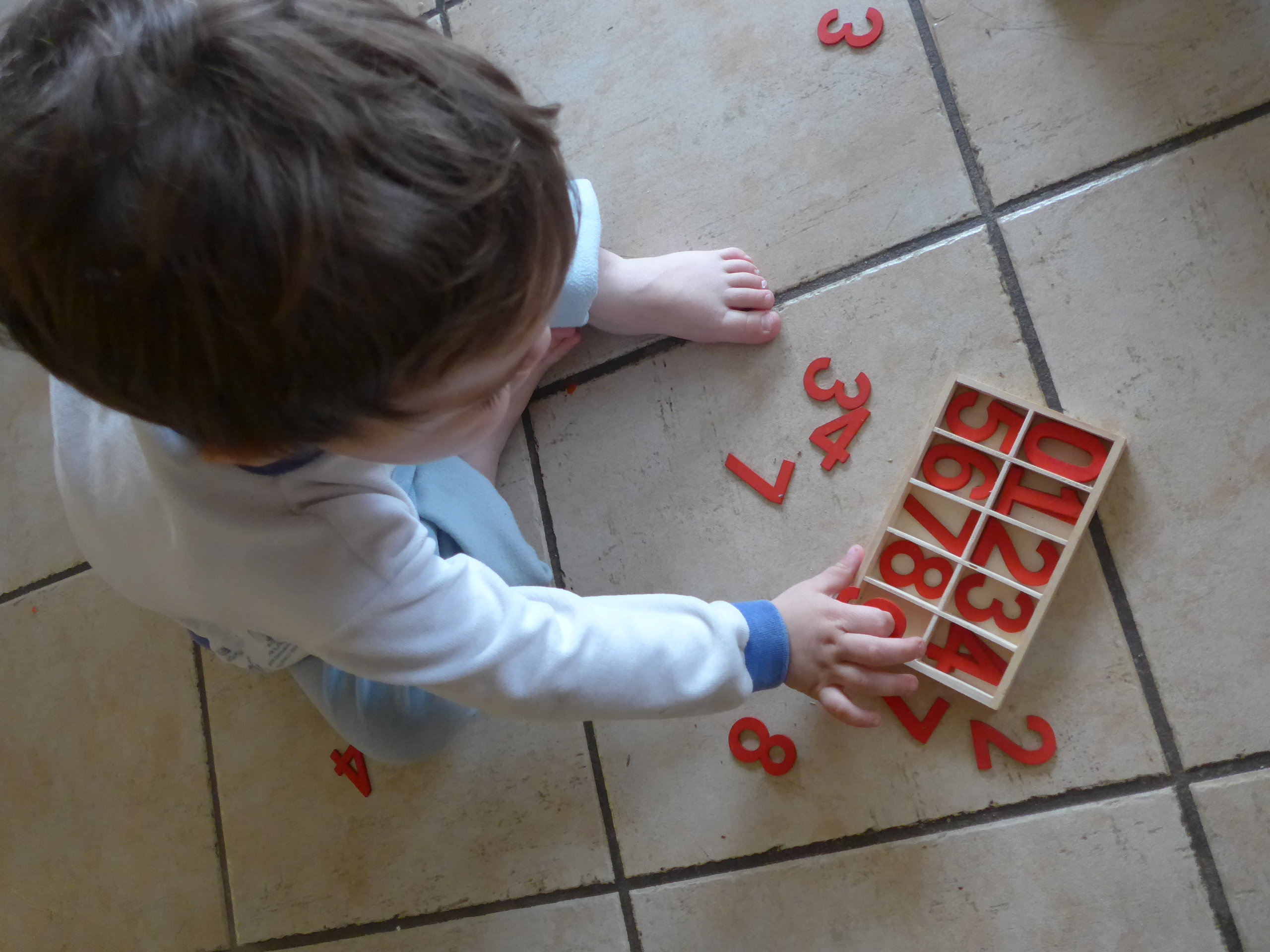L’autre jour, je retrouve Noé en train de jouer avec les chiffres et les barres rouges et bleues Montessori ! Il associait chaque chiffre avec une « case » de la barre. Bon, il y avait un petit bug puisqu’il commençait pas le zéro !