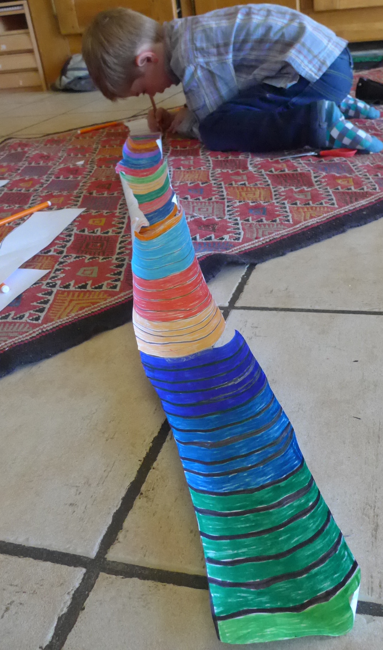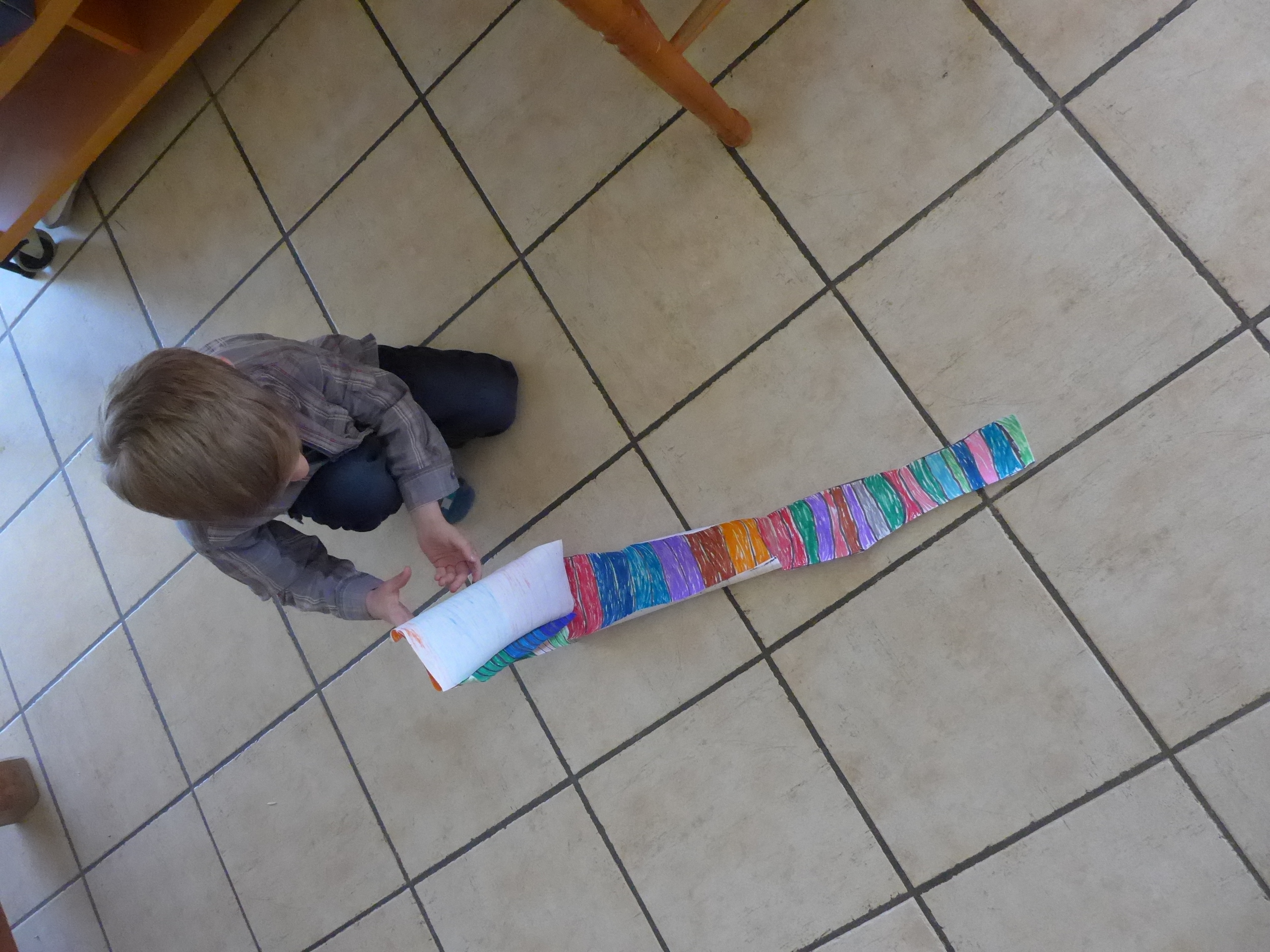De plus en plus je vois Noé bidouiller ses petits trucs et ça me réjouit ! Dernièrement, il avait pris une feuille de papier, découpé, tracé des traits puis colorié …
