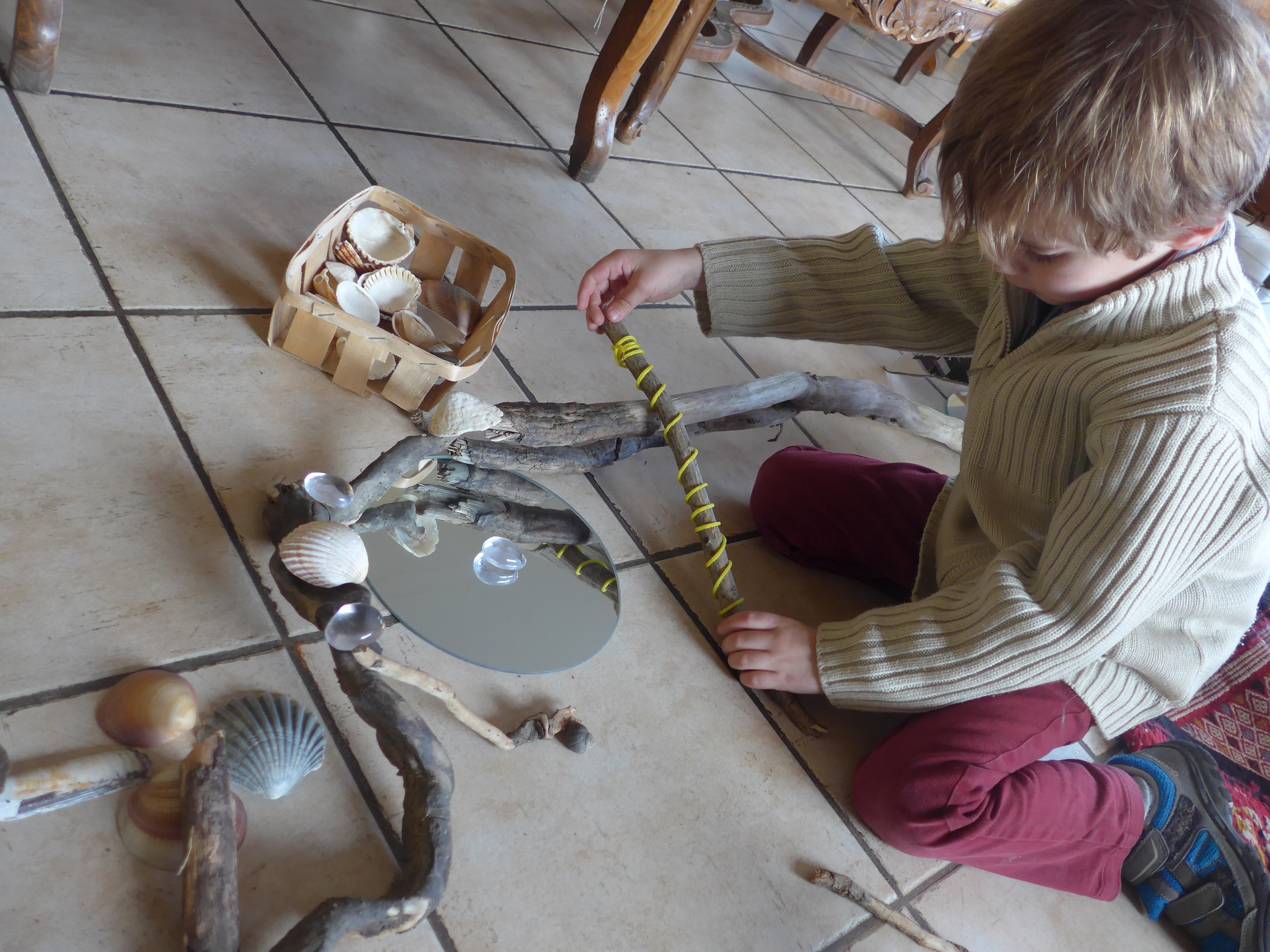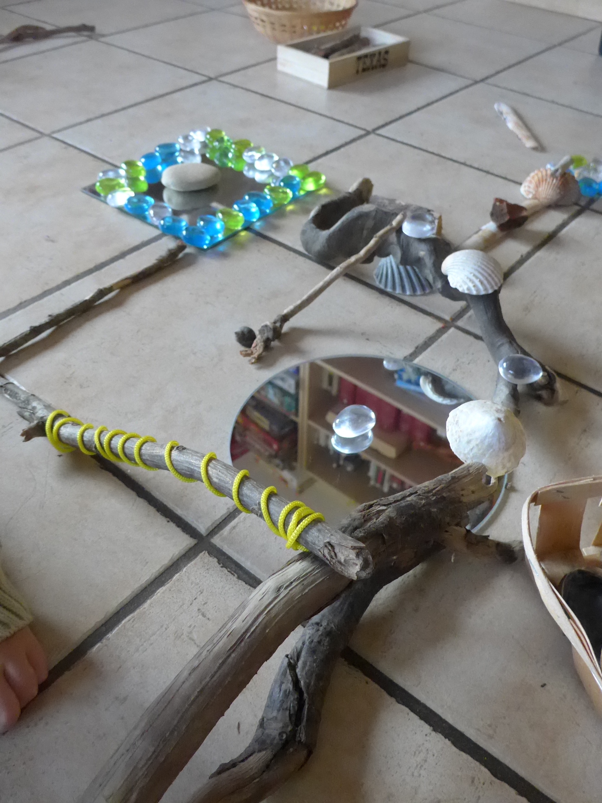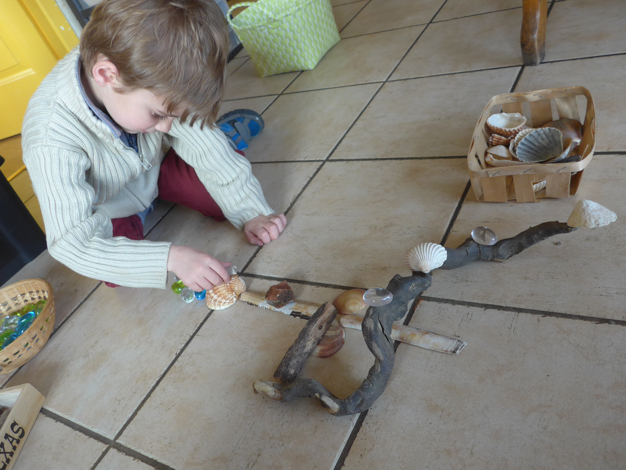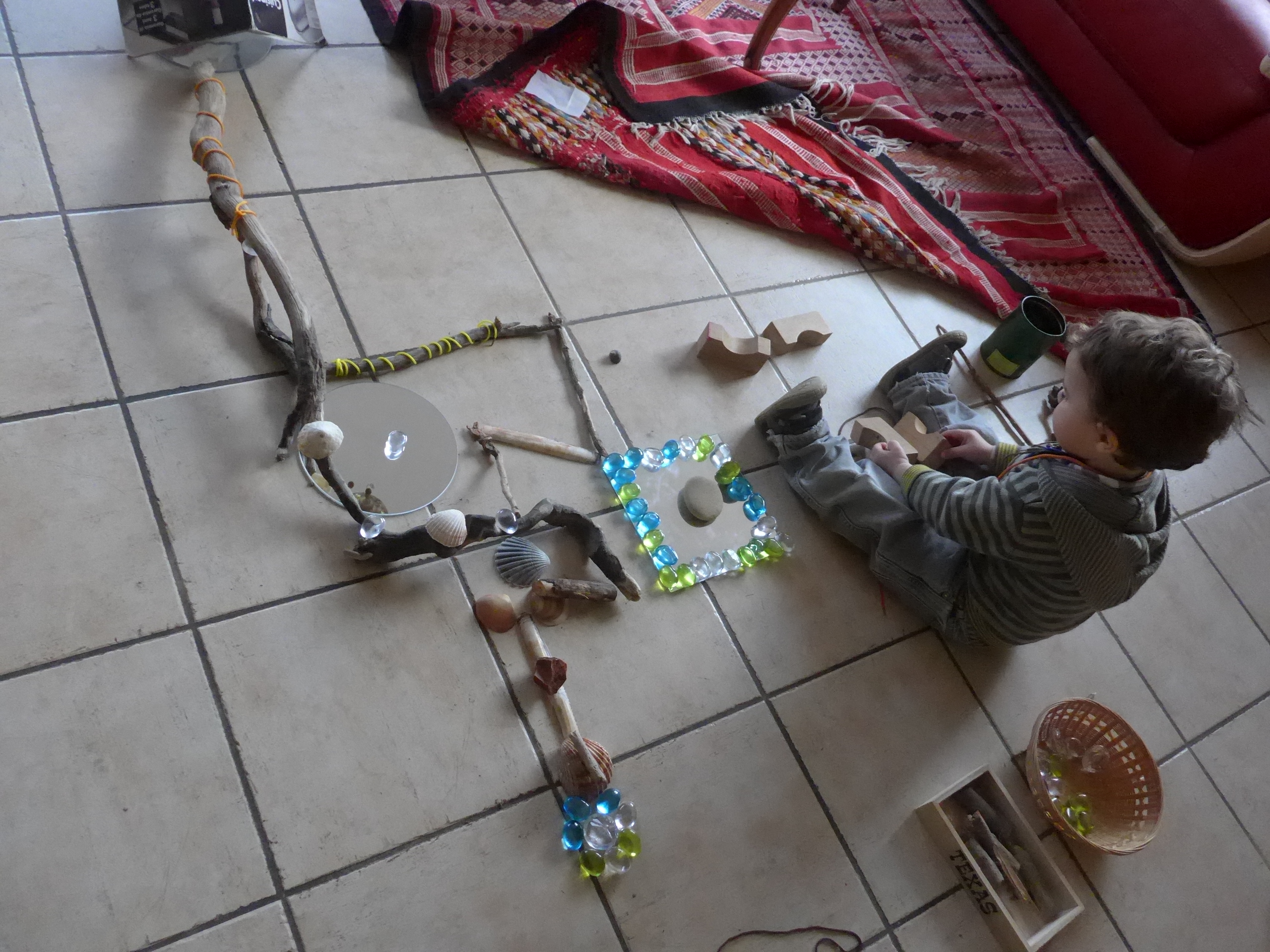 L’autre jour, j’ai posé par terre les morceaux de bois ramassés en promenade, les coquillages mis de côté au fil du temps quand on va à la mer et des « billes » . J’ai appelé Noé et je lui ai proposé de faire quelque chose avec. Il a commencé à sortir quelques éléments, à les assembler : oh, je vais faire le palais idéal ! Si vous ne connaissez pas le palais idéal du facteur Cheval, je vous invite à aller voir ici, ça vaut le détour !