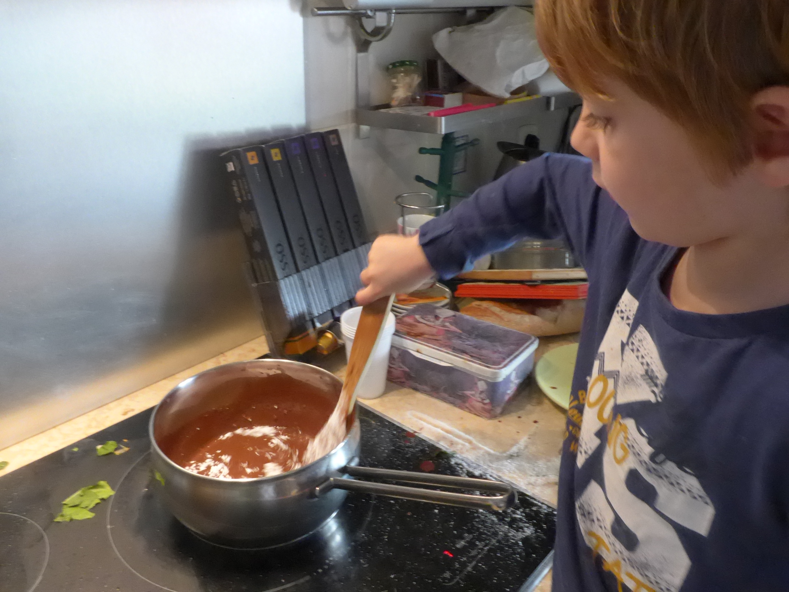 Un autre jour, il a voulu recommencer mais a mis le beurre avant le sucre. Son sucre n’arrivait plus à caraméliser et faisait des petites boules. Bon, Baptiste rajoute un peu de chocolat pour voir … Puis il fait un gâteau un peu au hasard, farine, sucre, levure, crème, chocolat … Et il rajoute dans sa pâte ses petites boules de sucre/beurre/chocolat.
