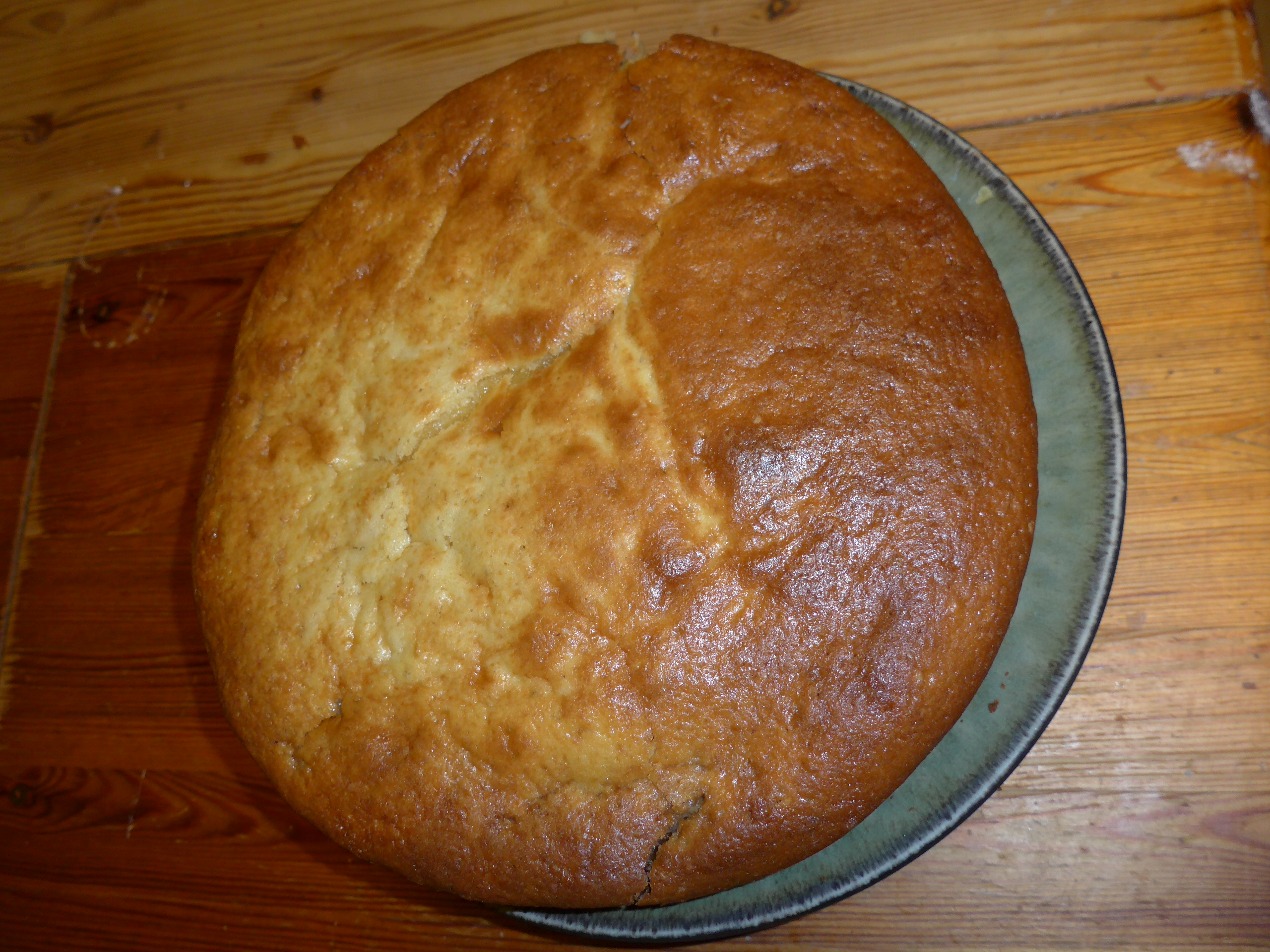 Une autre de ses expérimentations : il avait fait un mélange banane, cannelle, sucre et gélatine pour que ça tienne mieux. Pour utiliser cette crème, il a fait une pâte de gâteau au yaourt. Il a donc versé la pâte, son mélange, puis encore de la pâte. Pas très beau mais super bon !