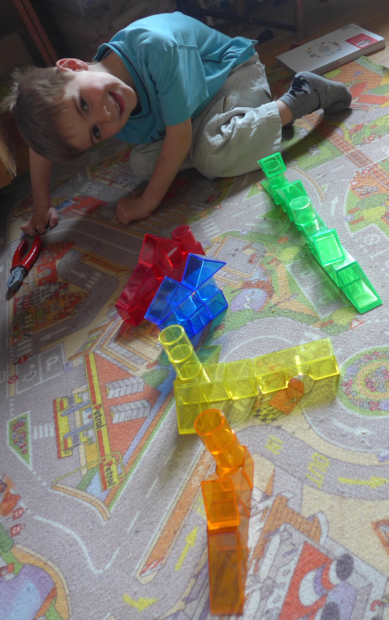 Mais le bientôt n’arrivant pas, Noé a décidé de prendre les choses en main ! Il est allé chercher ses bâtonnets de glace colorés, des petites voitures et a installé tout ça. Devant mon étonnement (quel rapport avec la table de l’été !?) il m’a expliqué que l’été on part loin en vacances et donc on prend la voiture ! Et effectivement, sa route ressemble bien à l’autoroute le jour de départ en vacances …