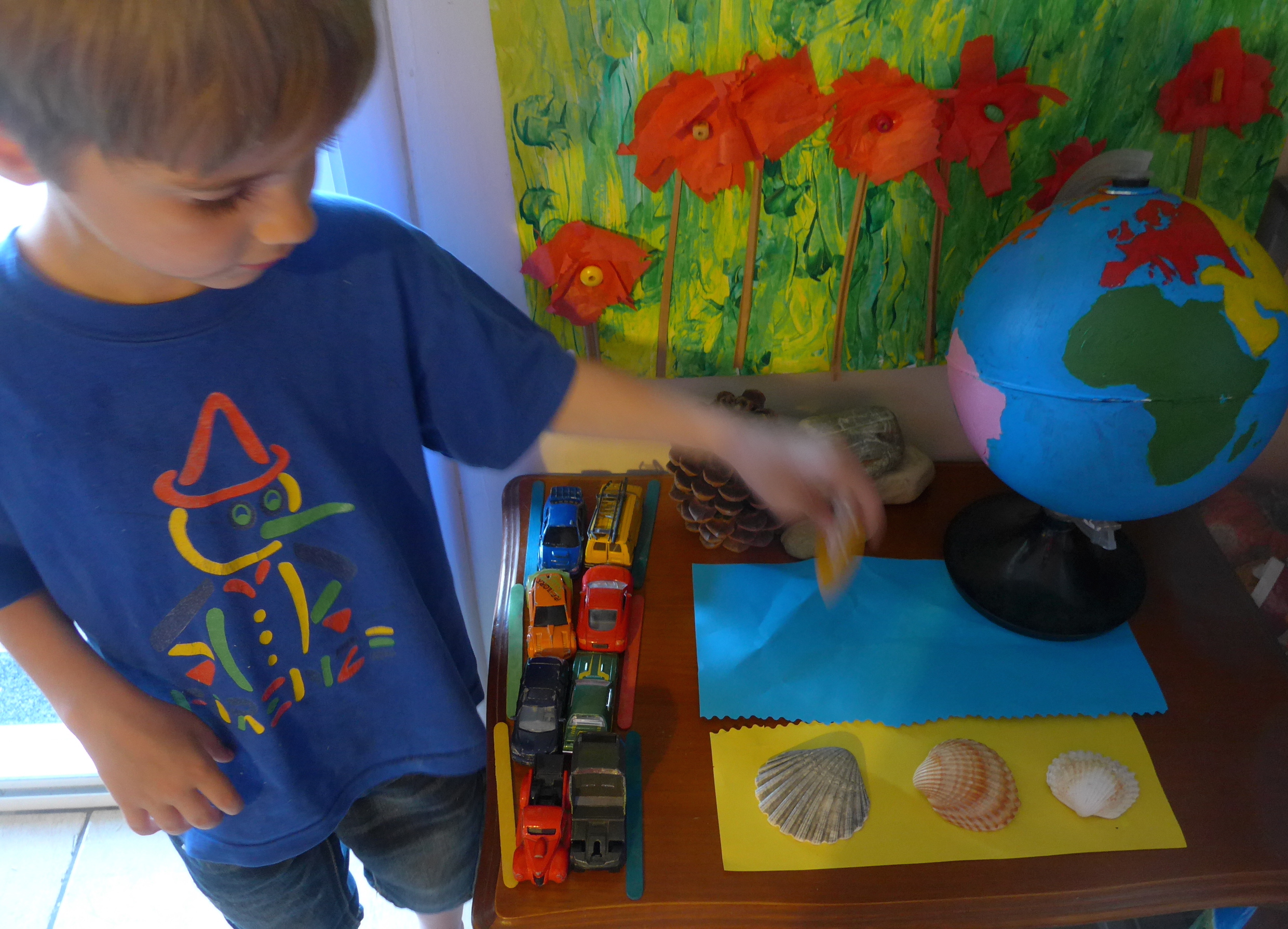 Puis il a installé le globe Montessori car pendant les vacances on va souvent dans d’autres pays m’a-t-il explique (l’année dernière, nous sommes allés en Grèce ), les pierres et la pomme de pin c’est pour les trésors ramassés en balade. Puis il est allé cherché des feuilles colorées bleue et jaune (la bleue froissée et découpée aux ciseaux crantées pour les vagues, je viens juste de m’en apercevoir !!!) , quelques coquillages, un bateau en bois.