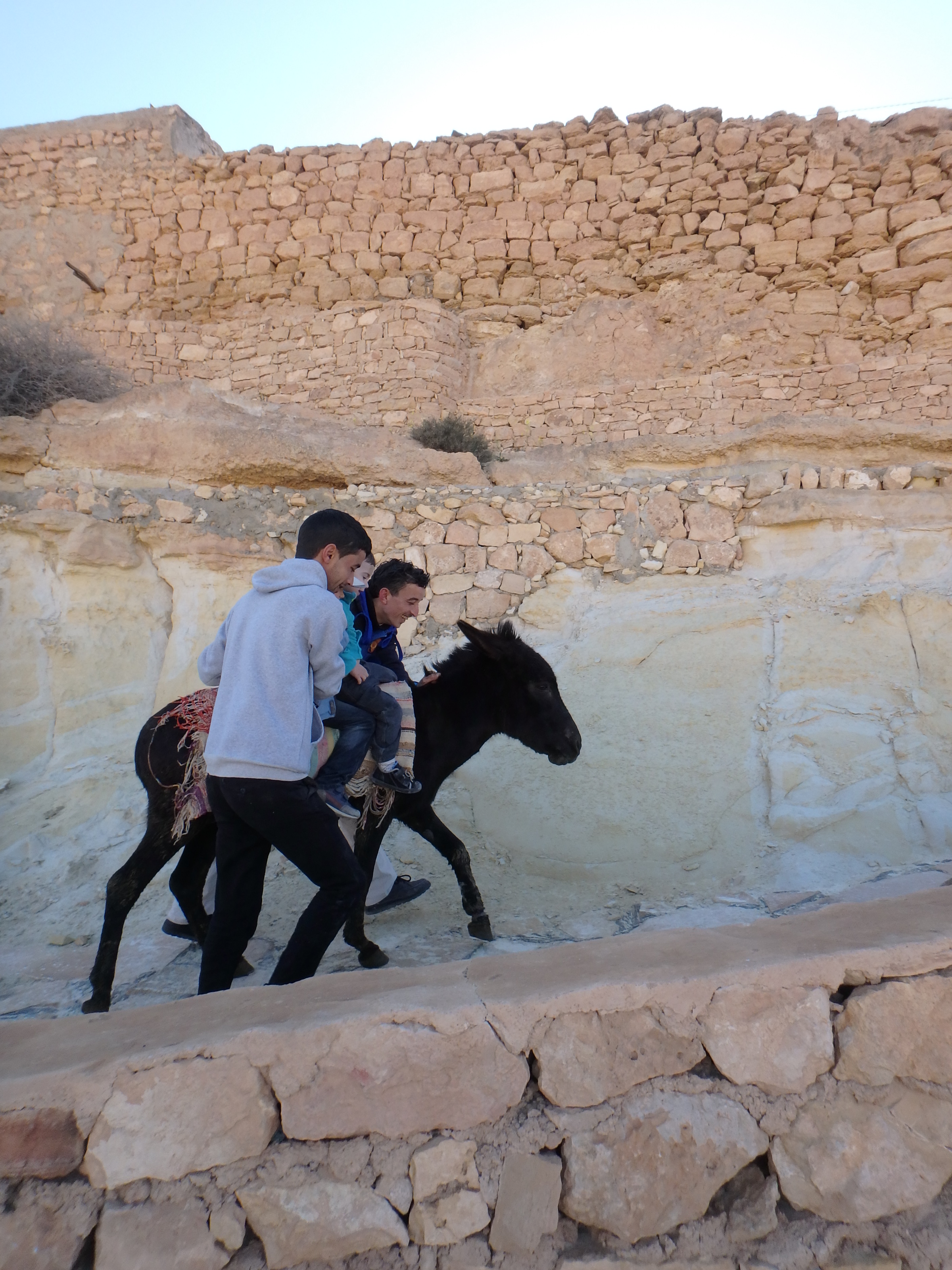 On fait une promenade (un peu mouvementée !) à dos d’âne avec Taoufik et Ahmed dans les rues de Chenini. Quelle rigolade ! L’âne, c’est le taxi de Chenini !