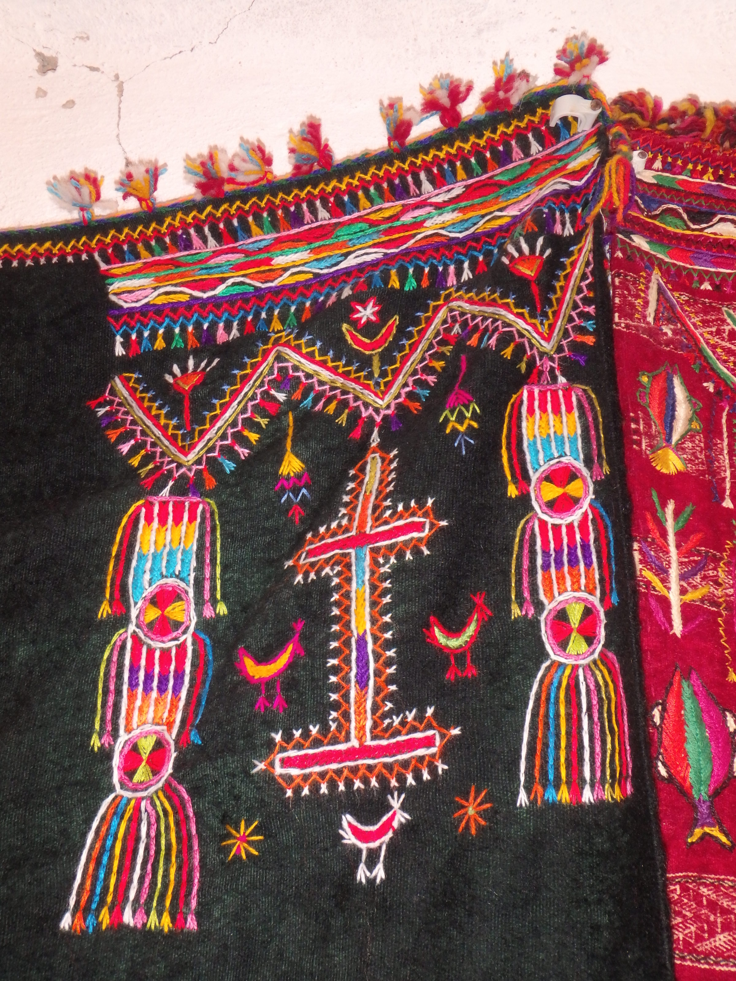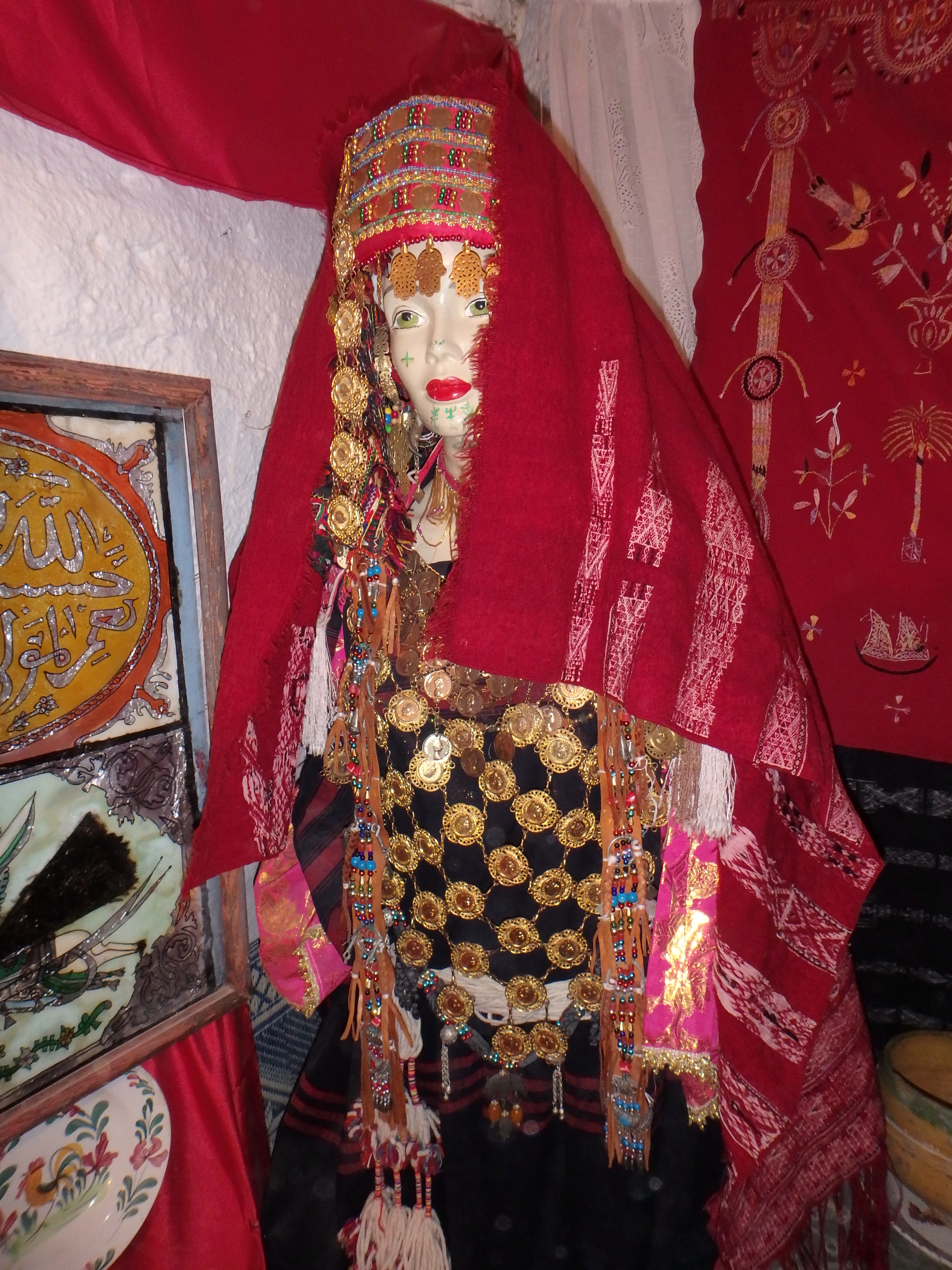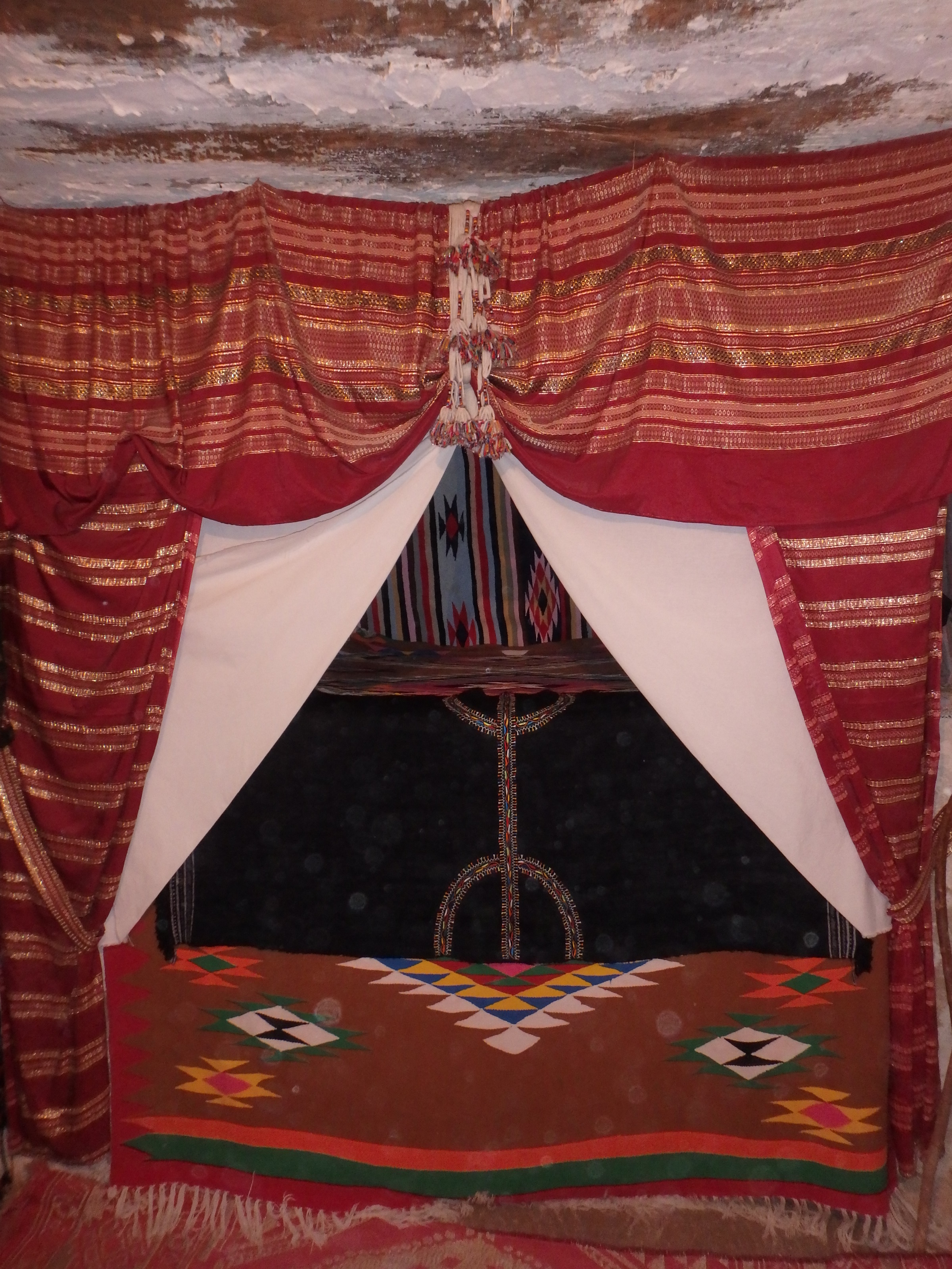 On retrouve le Z comme symbole de ce peuple (on le voit sur le tissu du lit, mais il est aussi souvent tatoué, sur le poignet en Tunisie, sur le front ou le menton dans d’autres pays) représentant l’homme libre, les pieds ancrés dans la terre et les bras vers le ciel. D’ailleurs, on devrait plutôt parler d’imazighen (les hommes libres) plutôt que de berbères.