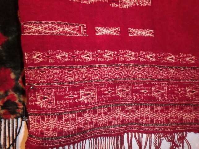 Ces tissus sont un travail de virtuose, extrêmement complexes puisque les femmes tissaient avec uniquement des fils blancs, de la laine et du lin, puis lorsqu’elle trempaient le tissu dans la teinture rouge, seuls les brins de laine s’imprégnaient de teinture, les brins de lin restaient blancs !