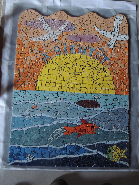 – Et Baptiste lors d’un stage avec les nouveaux Troubadours a crée lui aussi une mosaïque où l’on pouvait voir des poissons :