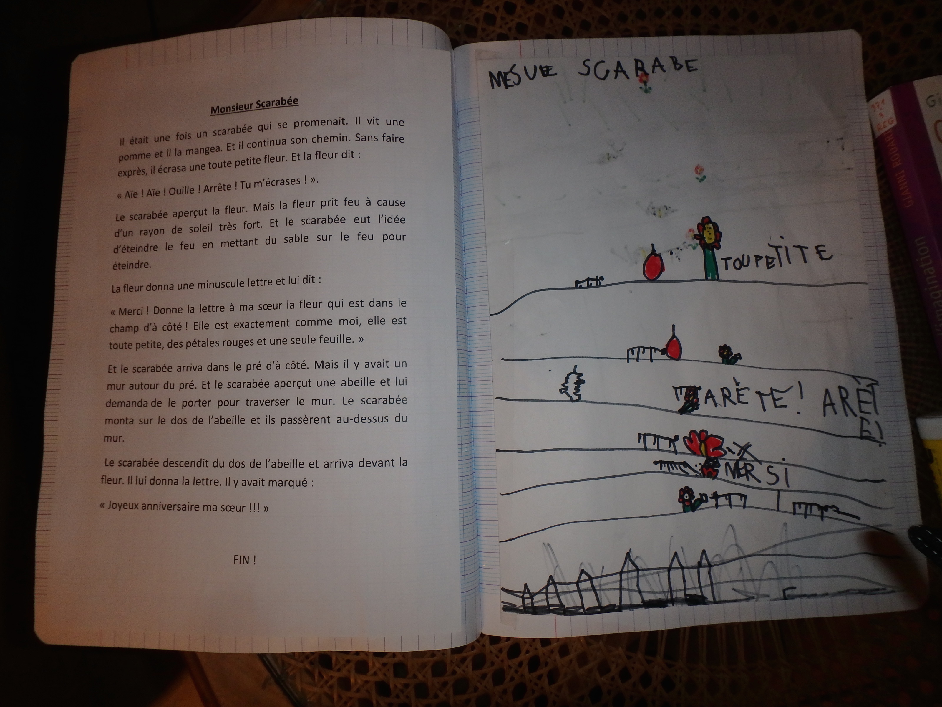 Par exemple, c’est avec les story cubes qu’il a inventé cette petite histoire : j’écrivais ce qu’il racontait puis à côté il a dessiné l’histoire, plutôt sous forme plus ou moins de BD puisqu’il a représenté successivement les différents épisodes de l’histoire. Mais parfois, c’est un dessin unique pour son histoire !