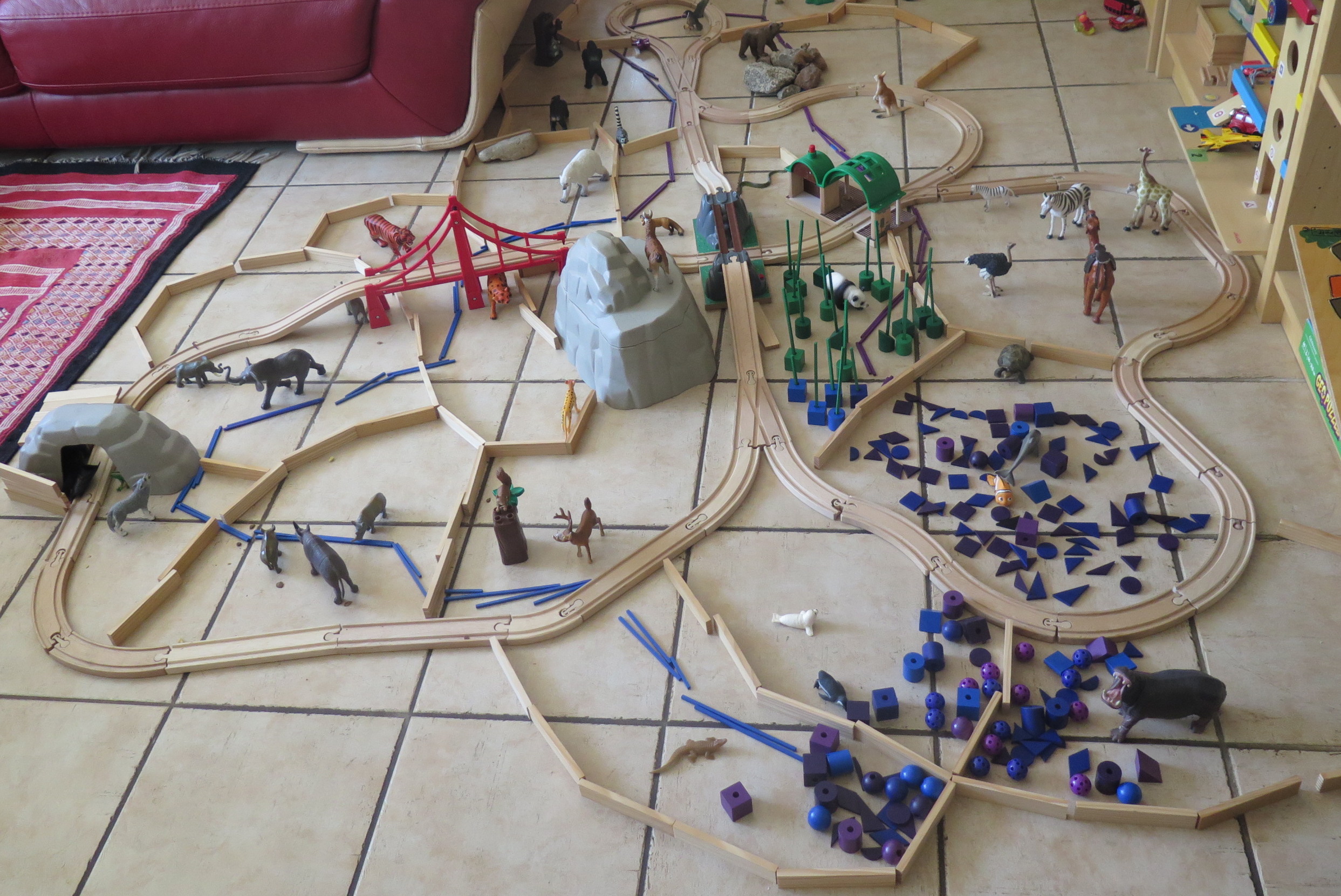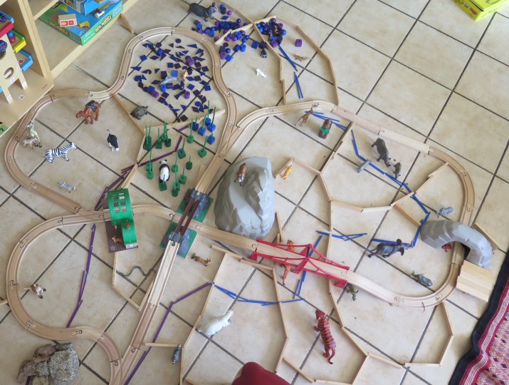 Et puis parfois Noé utilise le spielgaben avec d’autres jeux : ici avec son circuit de train, kapla, pierres et animaux !