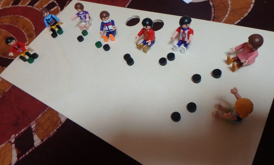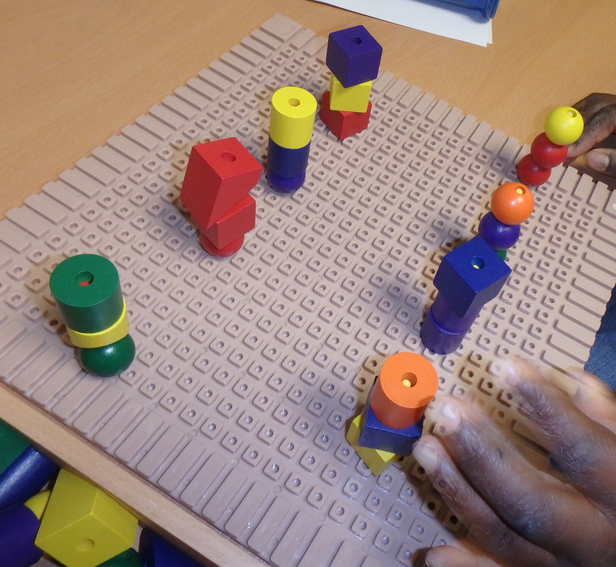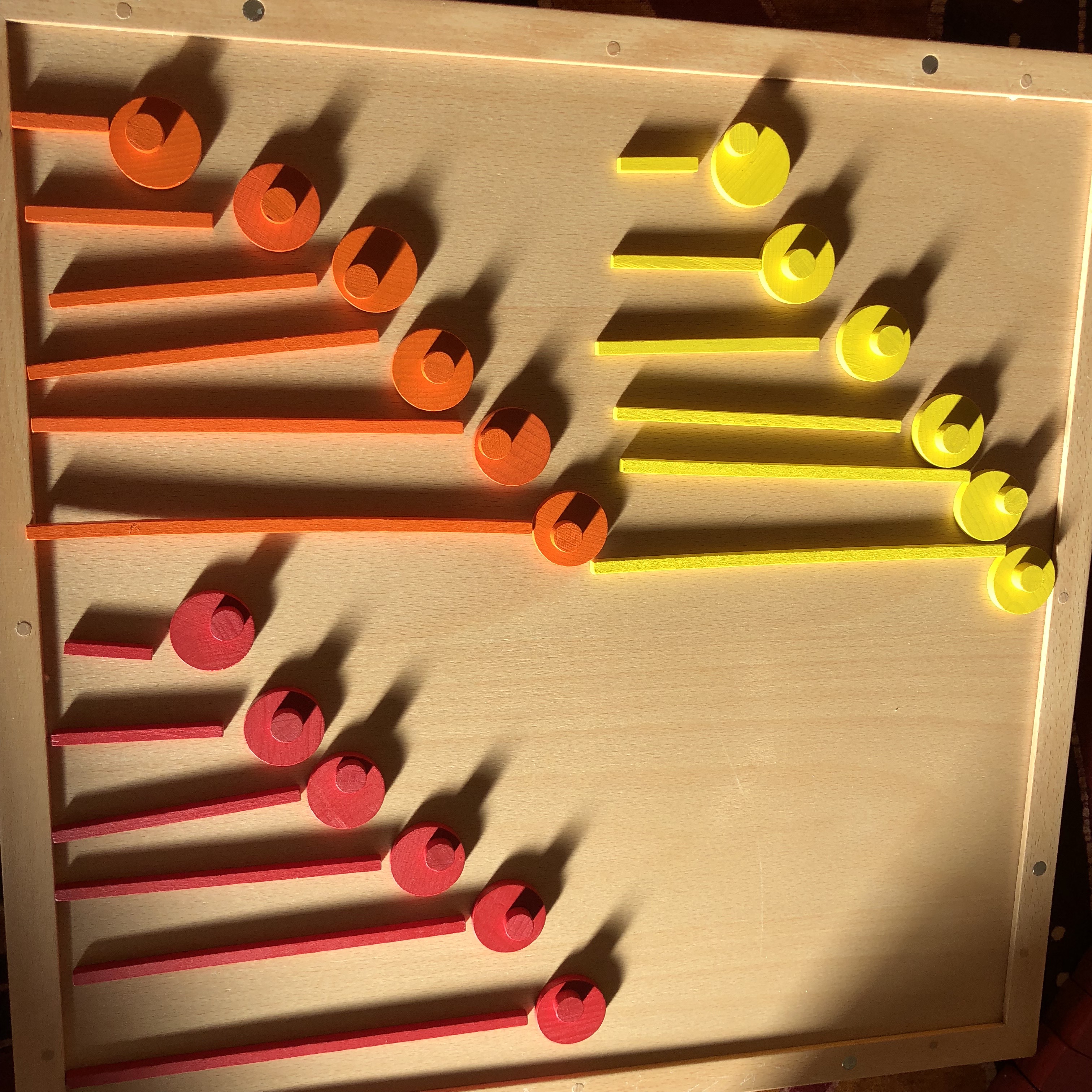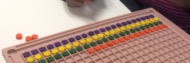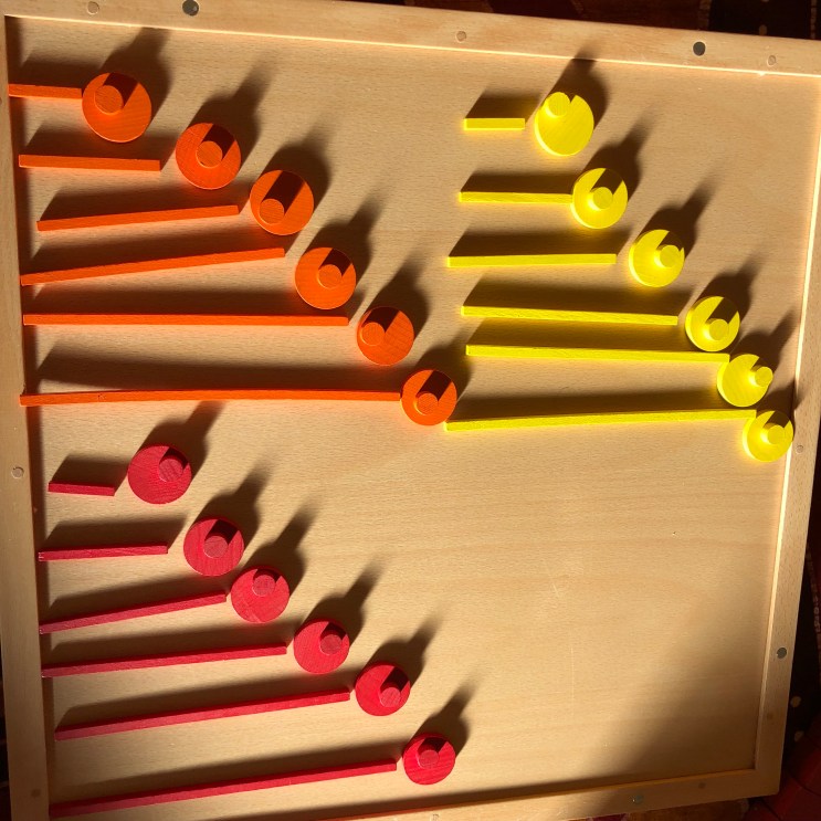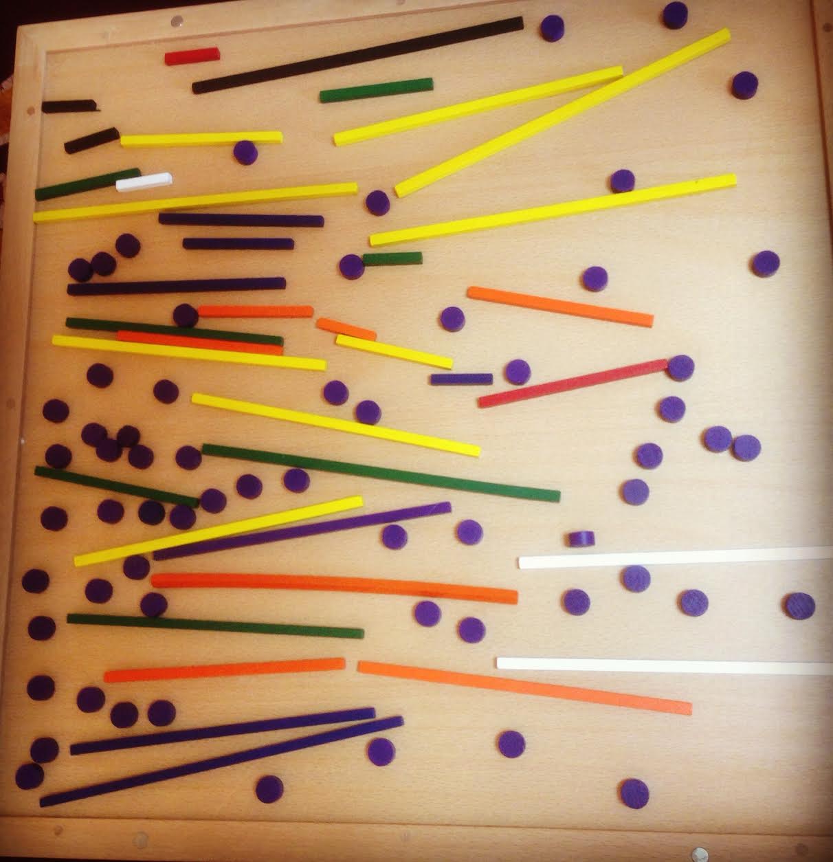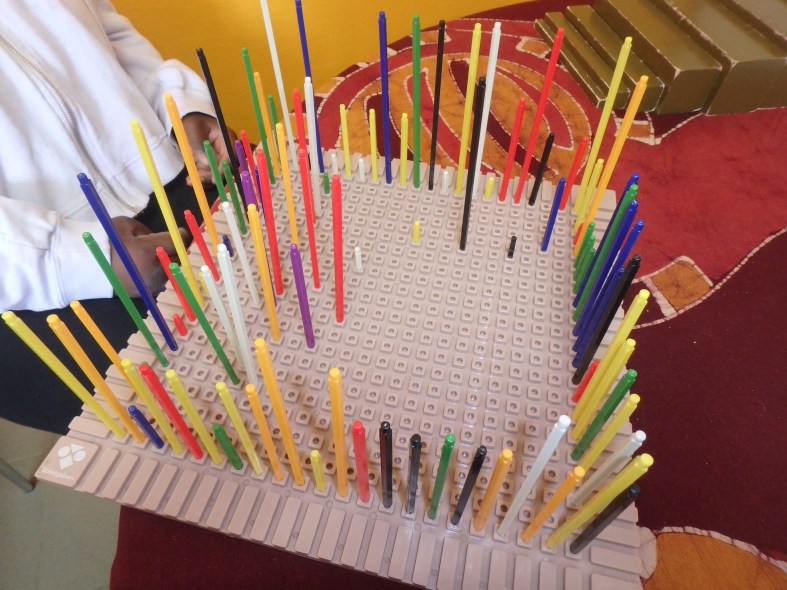 Puis classement des bâtonnets sans fiche … puis encore d’une autre couleur … et encore … (la photo est à l’envers) : on monte l’escalier avec le doigt