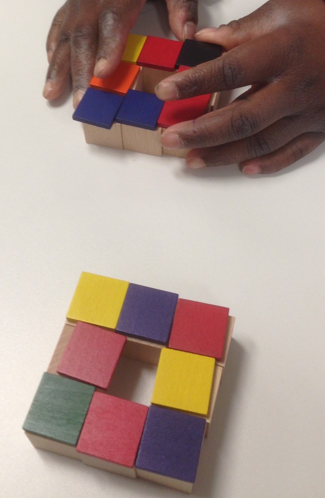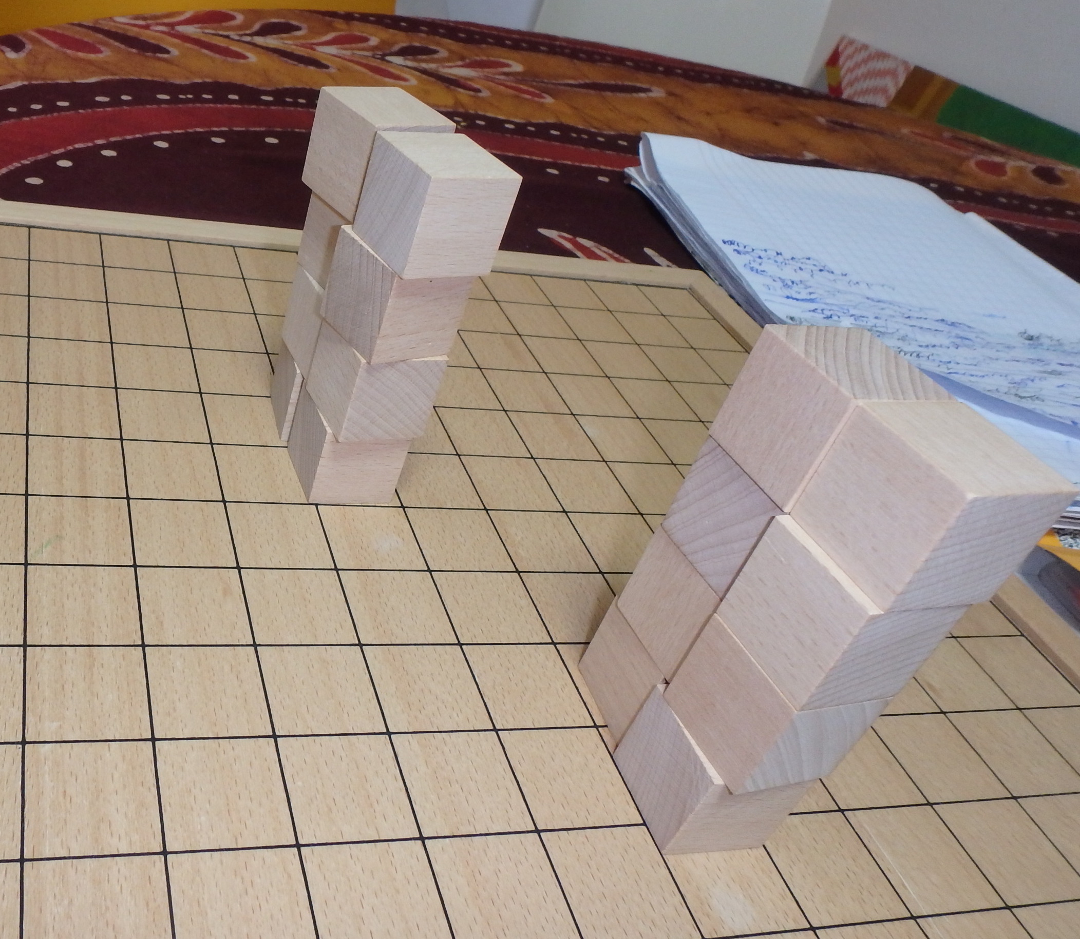 Placer les cubes comme moi puis placer un carré coloré sur chaque cube