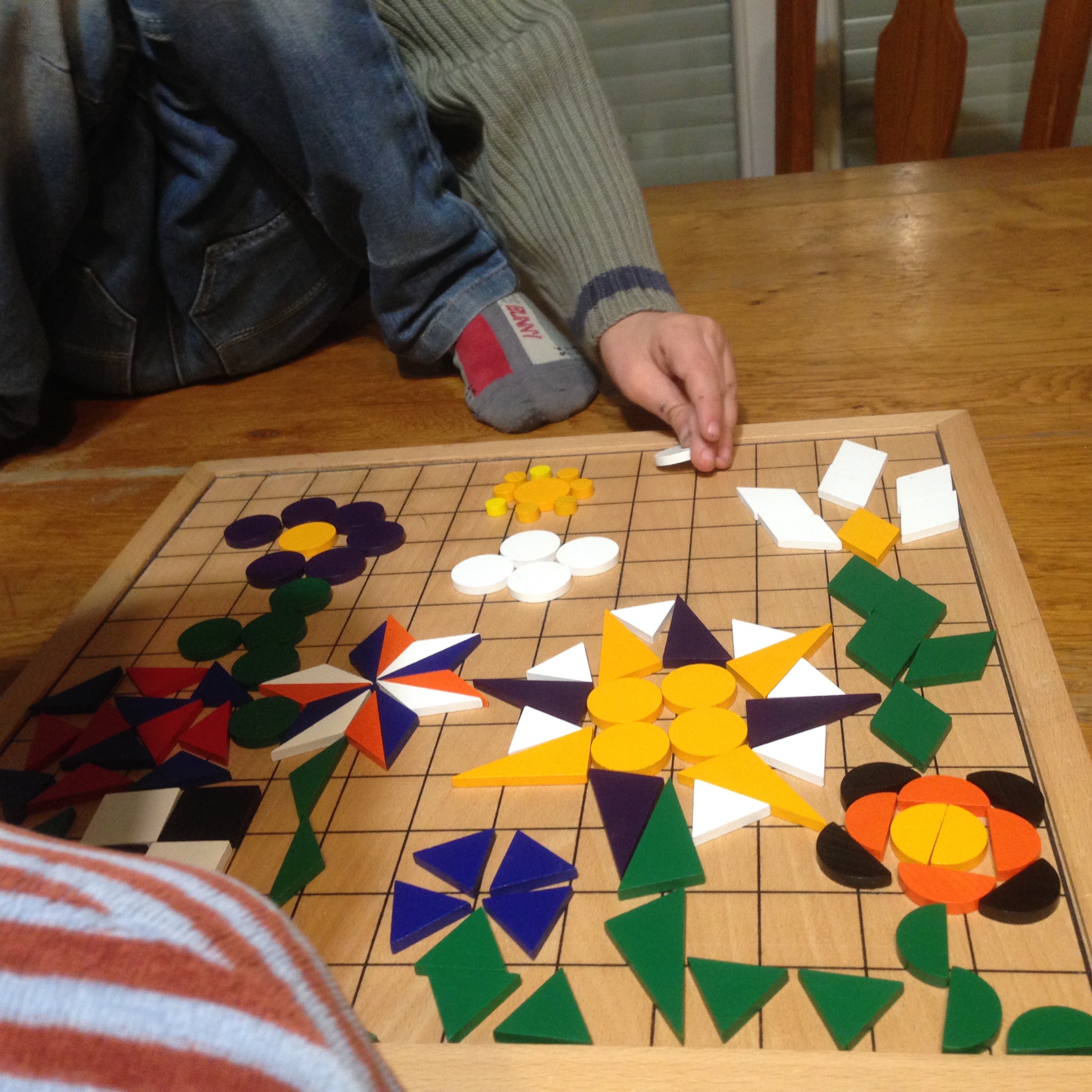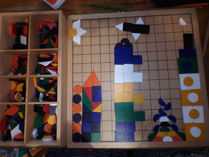 Et puis hier soir encore, on n’a pas pris de photo, mais Noé s’est intéressé à juste quatre losanges pour voir tout ce qu’on pouvait juste avec ces quatre formes ! C’était super intéressant ! La géométrie en jouant …