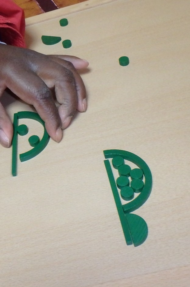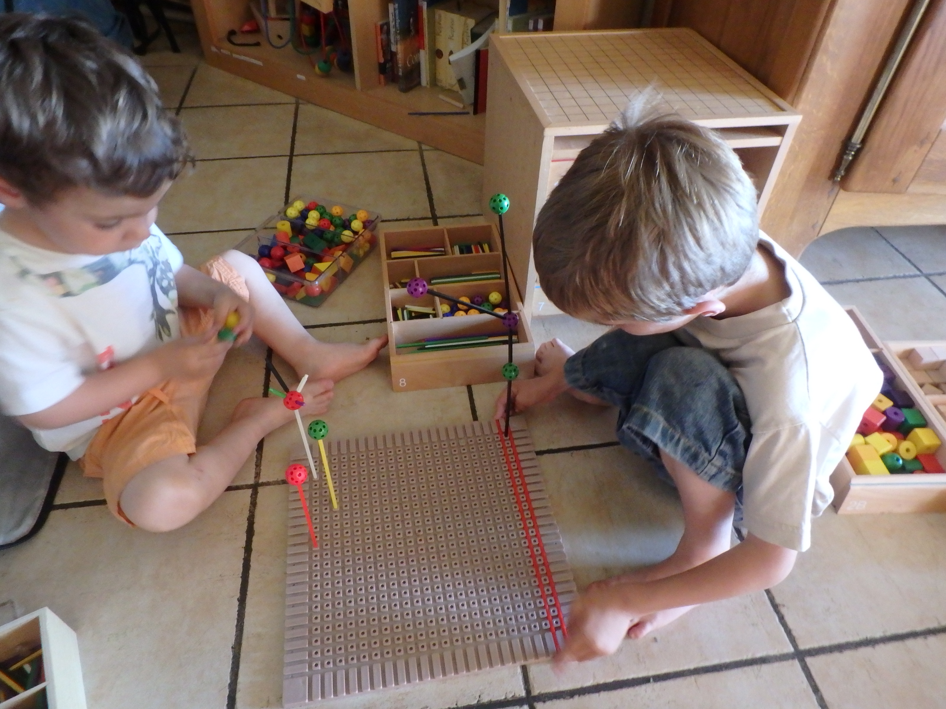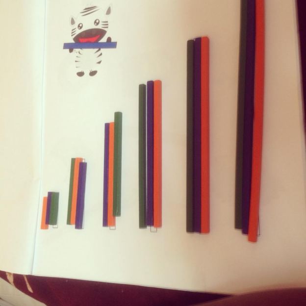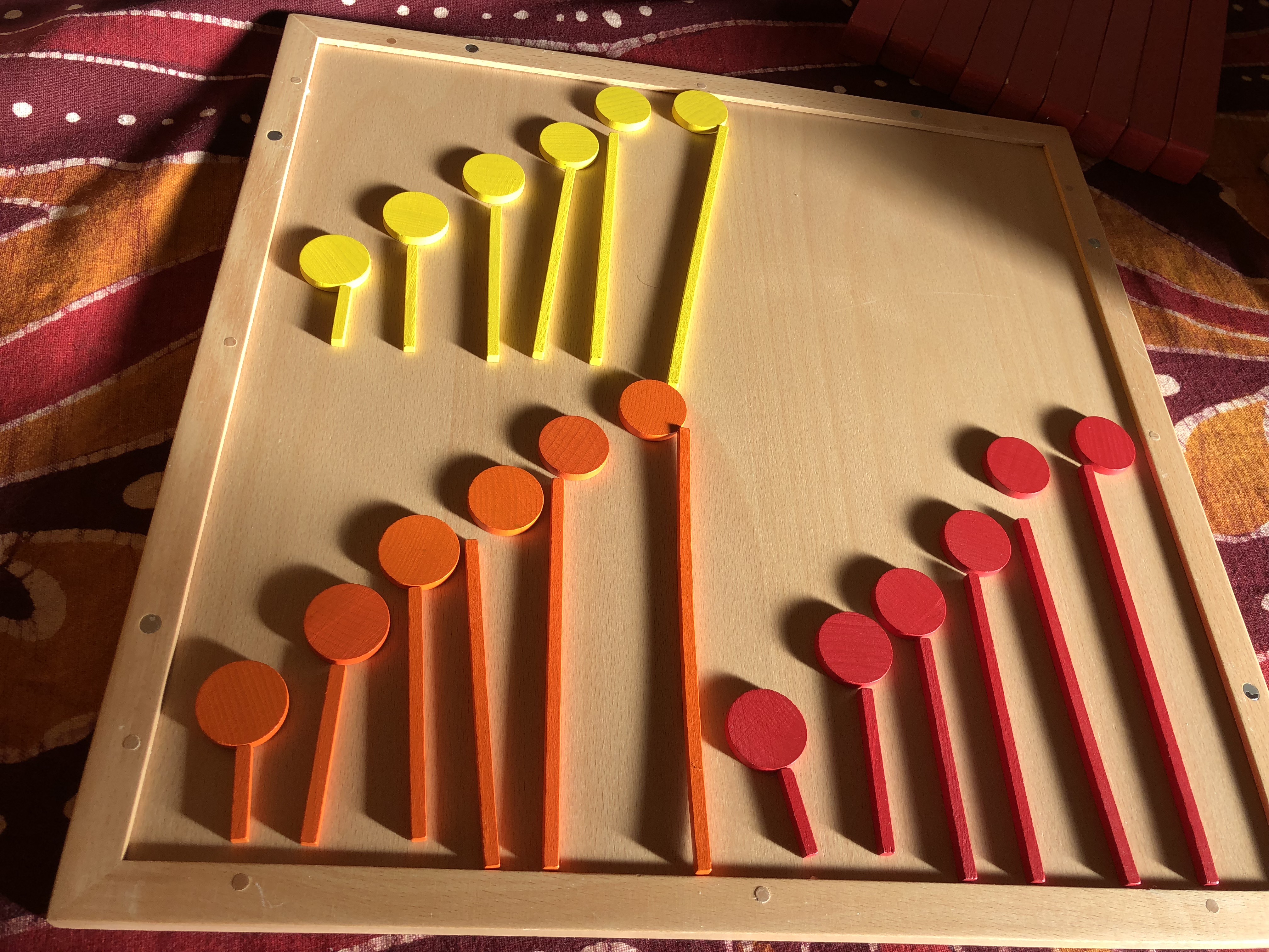 On a aussi associé les barres rouges Montessori et les petits bâtonnets de Spielgaben. Là, il s’agissait de mettre les grands d’un côté, puis les moyens, et enfin les petits de l’autre.