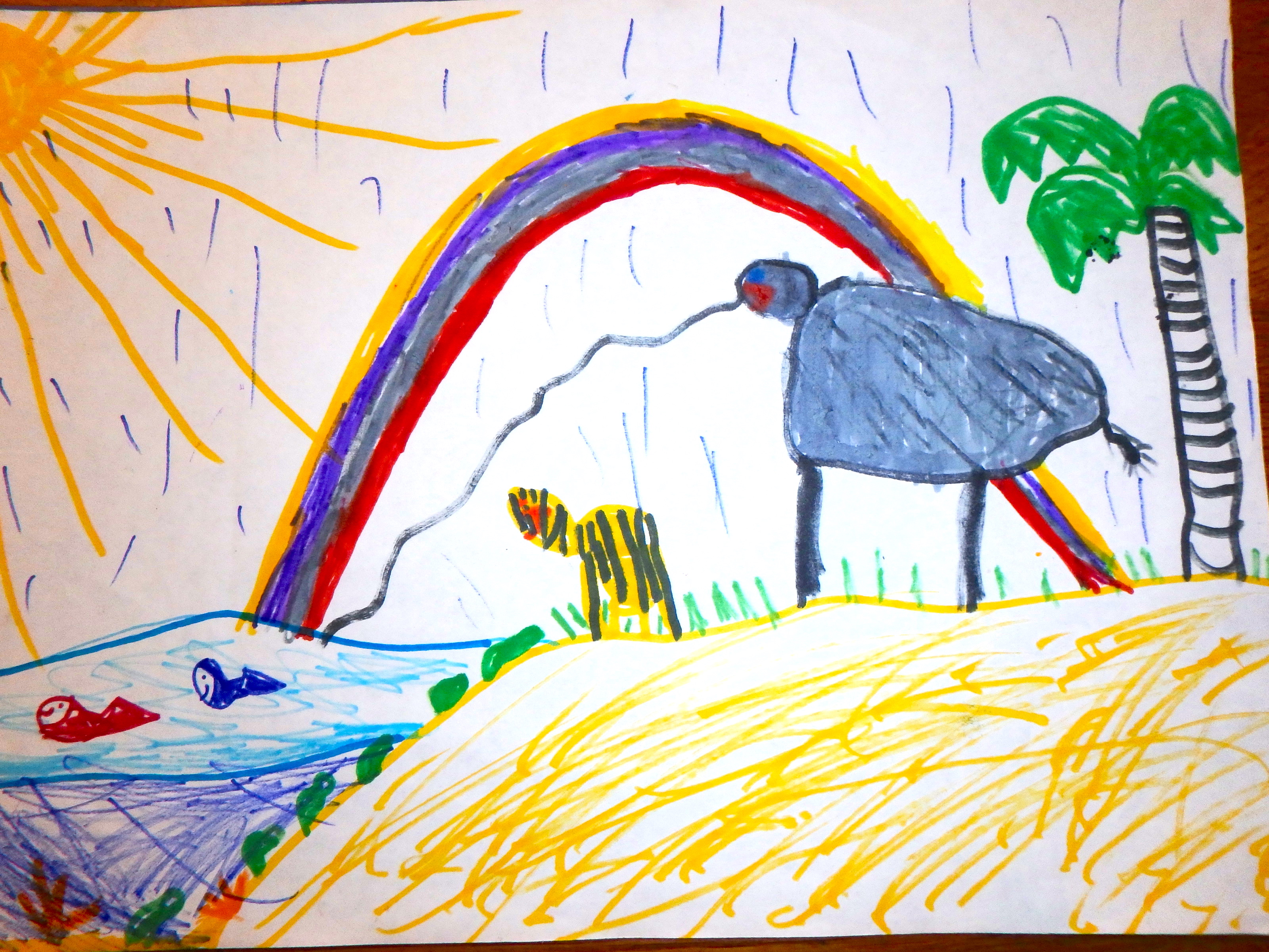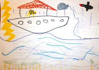 Puis, je lui ai conseillé de repasser au feutre sur certains dessins qu’il avait tracés aux crayons de couleur peu visibles, d’améliorer un peu le coloriage de certaines parties …