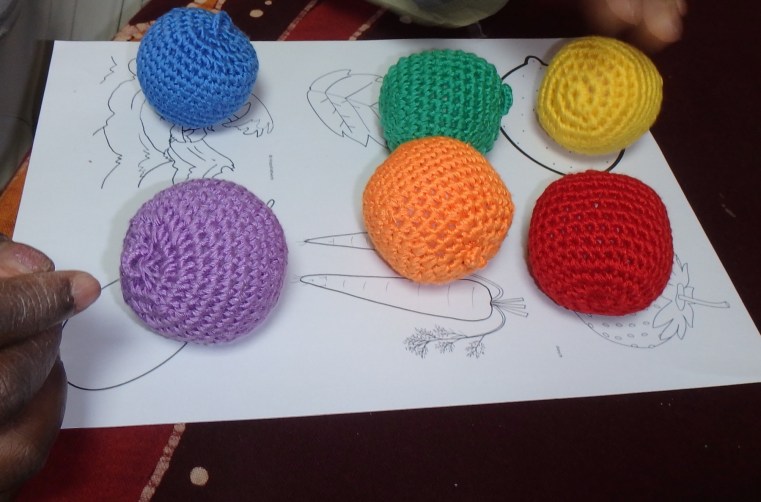 Activités autour des couleurs : placer la balle de la bonne couleur sur l’objet correspondant (orange sur la carotte, jaune sur le citron …) tout en nommant les couleurs ( j’ai associé le nom de la couleur à un objet référent, toujours le même,  pour que ce soit plus facile quand on parle : rouge tomate, jaune soleil, etc.)