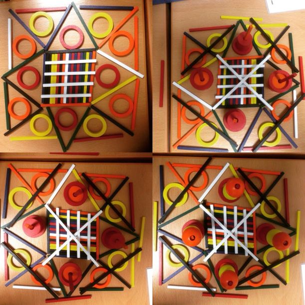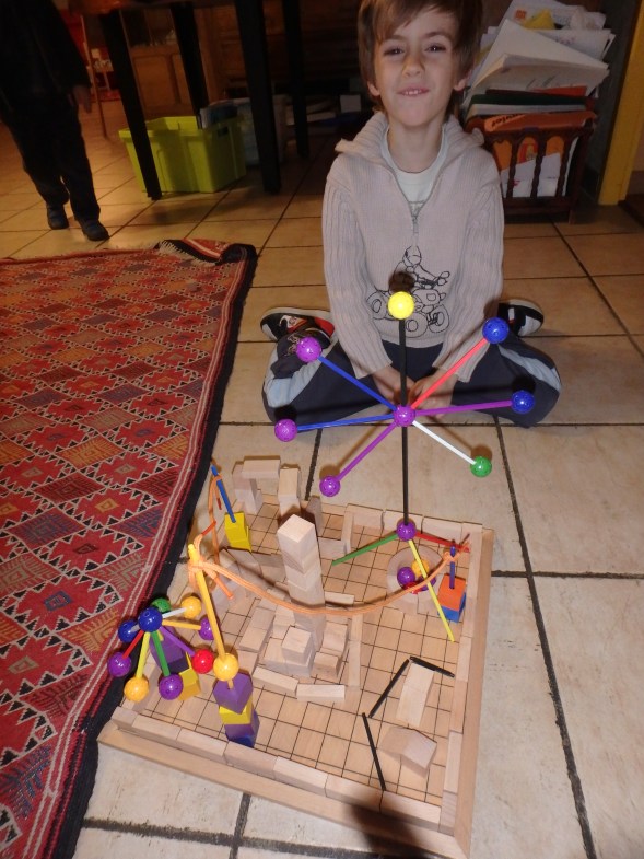 Voilà, spielgaben pour jouer, pour inventer, pour voir le monde d’une façon plus organisée, pour apprendre à maitriser ses gestes, pour apprendre, pour expérimenter, pour faire une activité avec un nombre limité d’éléments ou au contraire avec toutes les boîtes, pour jouer seul ou à plusieurs mains, pour représenter quelque chose ou faire une belle composition mais qui ne ressemble à rien de connu ! Mille et une façons de l’utiliser, de façon totalement libre ou très dirigée, tout est possible et c’est ce que j’aime ! Ca fait trois ans que nous l’avons, et je l’aime toujours autant ! A certaines périodes, il est un peu oublié et à d’autres, il sert quotidiennement ! Souvent, il suffit que je m’installe moi-même pour y jouer et hop !!! L’intérêt renaît et les enfants se précipitent !!!