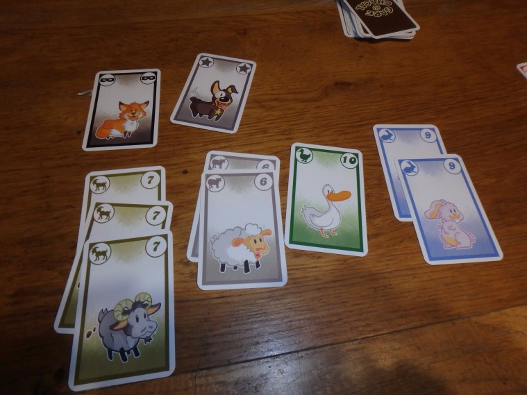 Pour ce faire, chaque joueur a 4 cartes en main. A chaque tour, il peut poser une carte animal (ou deux de la même espèce) puis pioche pour avoir toujours 4 cartes en main. Mais attention, si l’on joue à 4 par exemple, on n’a pas le droit de faire plus de 6 élevages ( c’est à dire 6 types d’animaux différents).