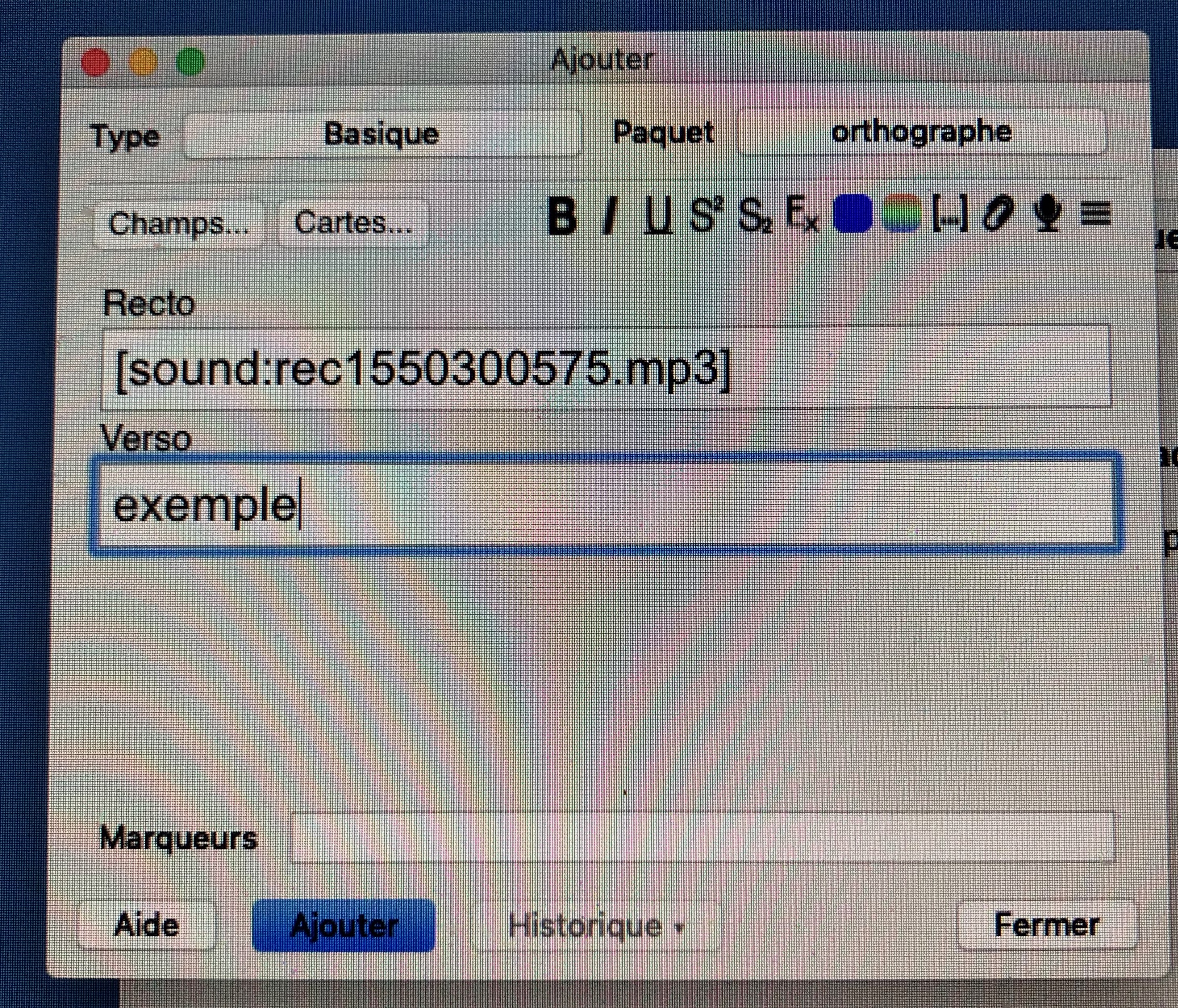 Vous obtenez ceci. au recto, un son enregistré. au verso, la réponse à la question (le mot à bien orthographier était ici exemple). Vous pouvez ensuite ajouter autant de cartes que vous voulez en cliquant sur ajouter. Quand vous avez terminé, cliquez sur fermer.