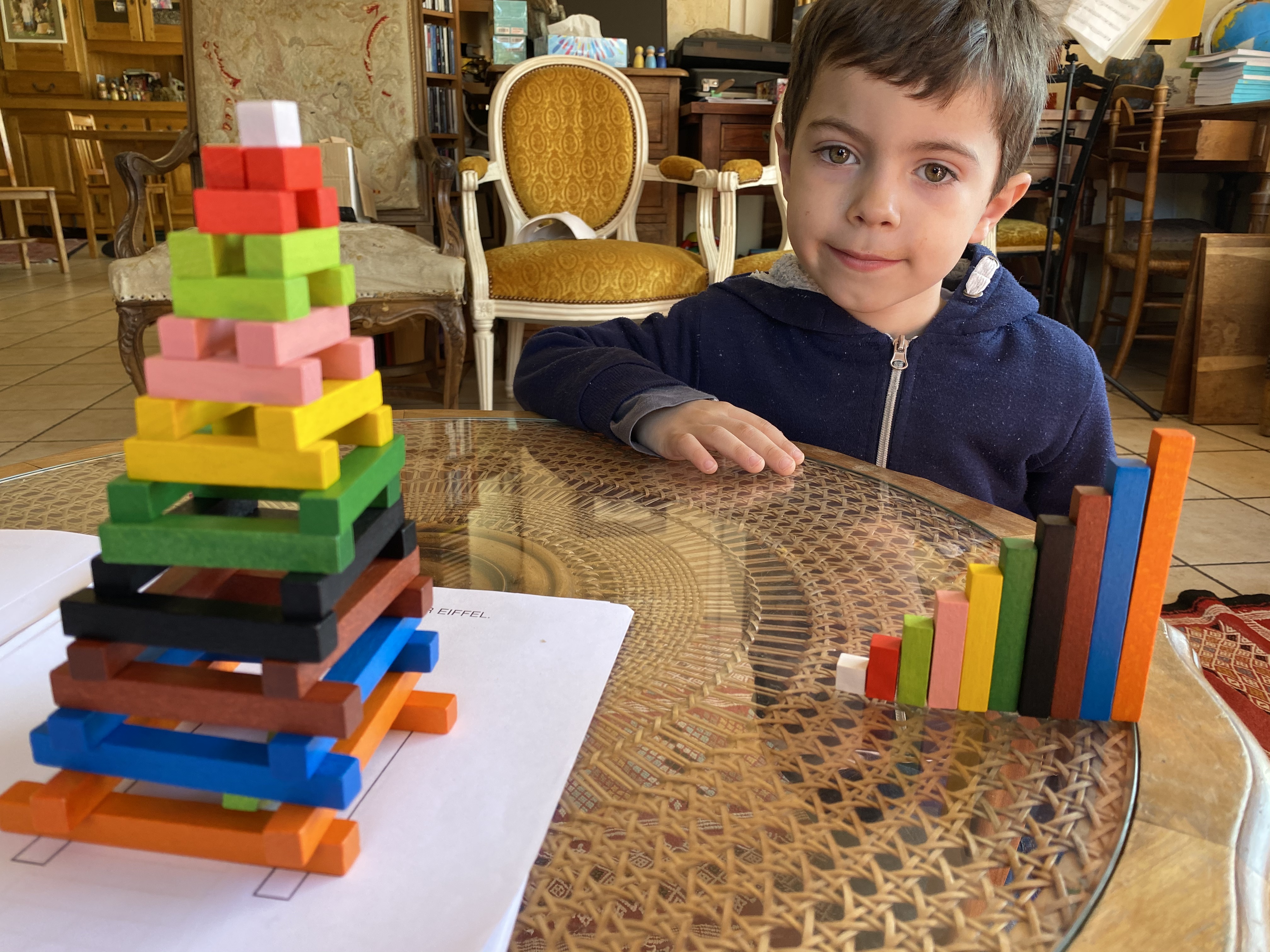 Le lendemain, c’est une tour Eiffel qu’il a construite. Bien choisir les réglettes pour bien les prendre des plus grandes aux plus petites, les poser avec délicatesse …