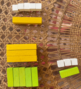 5 – Il existe également le matériel Cuisenaire, un peu dans le même principe. Chaque réglette correspond à un nombre entre 1 et 10 : si l’on place des cubes unités blancs à côté d’une réglette, on peut voir combien d’unités elle contient. Les réglettes rouges correspondent au 2, les vertes correspondent au 3, les jaunes au 5, les orange au 10 …Si je place côte à côte 4 réglettes vertes de 3 , elles font la même longueur que la plus grande réglette orange de 10 et que la réglette rouge de 2. 4×3=12 . Cela peut paraître compliqué mais manipuler, toujours manipuler permet de comprendre, ressentir les équivalences et le sens de la multiplication. Si vous n’avez pas ce matériel, vous pouvez les imprimer (même si rien ne vaut la manipulation d’un matériel en bois) ici par exemple : https://site.ac-martinique.fr/pole-maths/?p=4080