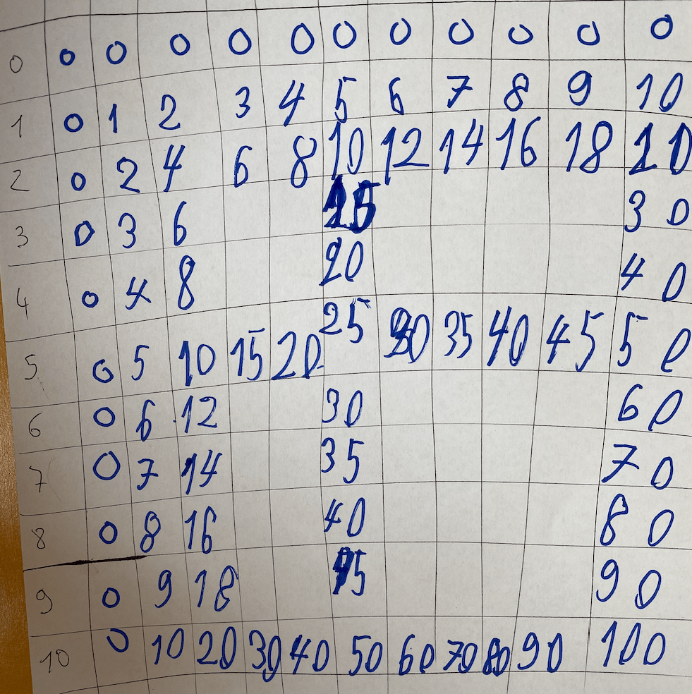 6 – Le pédagogue John Holt dans son livre sur les apprentissages autonomes (que je vous conseille vivement !) suggérait, lorsque l’enfant avait compris le mécanisme de la multiplication par des petites manipulations, d’afficher une grande table de multiplication vierge sur une porte et de le laisser la remplir à son rythme, comme il le souhaitait, même si cela prenait plusieurs semaines, au gré des découvertes de la manipulation. Cela n’est pas très grave s’il fait des erreurs de calcul. Puis lorsqu’il a terminé on peut la remplacer par une autre. Il commencera sans doute par les tables de 0, de 1, de 10 … Au fur et à mesure du remplissage, il se rendra compte qu’il y a de moins en moins de cases compliquées à remplir. Il peut se donner comme challenge de la remplir plus vite que la précédente, avec à terme l’objectif d’être capable de la remplir le plus vite possible, en battant son précédent « record » !