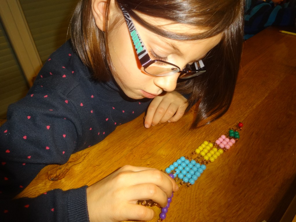 3 – La pédagogie Montessori utilise du matériel qui permet de manipuler pour acquérir les notions mathématiques. Il existe ainsi des barrettes de perles : des barrettes par exemple contenant à chaque fois 4 perles jaunes ou alors 6 perles violettes. Ainsi je peux prendre trois fois la barre de 6 perles et en comptant les perles je vois qu’il y en a 18. L’enfant peut aussi piocher au hasard un petit papier avec un calcul (6×3), prendre les barrettes correspondantes, compter les perles et écrire le résultat.