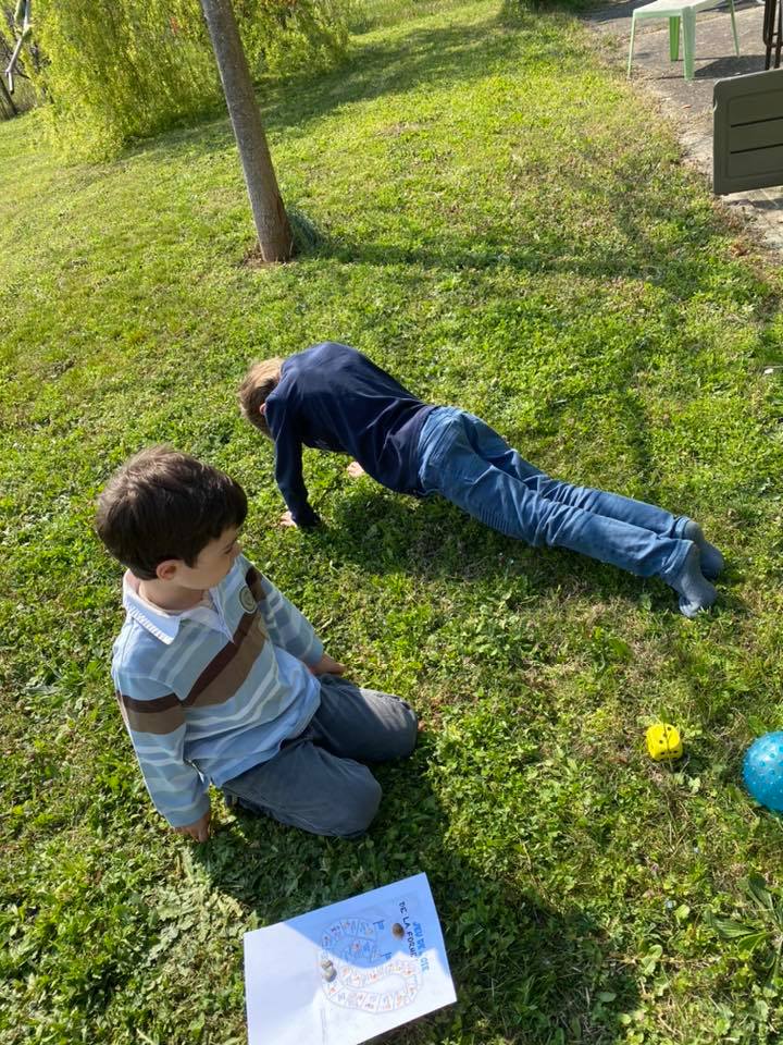 Comme nous avons la chance d’avoir un jardin (tellement appréciable en ces jours confinés …), je leur ai proposé de faire un peu de land art dans le jardin.