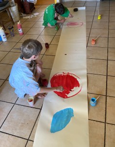 J’ai donc sorti un grande bande de papier, quelques pots de peinture (que j’ai toujours dispos depuis notre jeu de peindre ! ) disposés de part et d’autre de la feuille avec un pinceau par pot. Vous êtes prêts ?